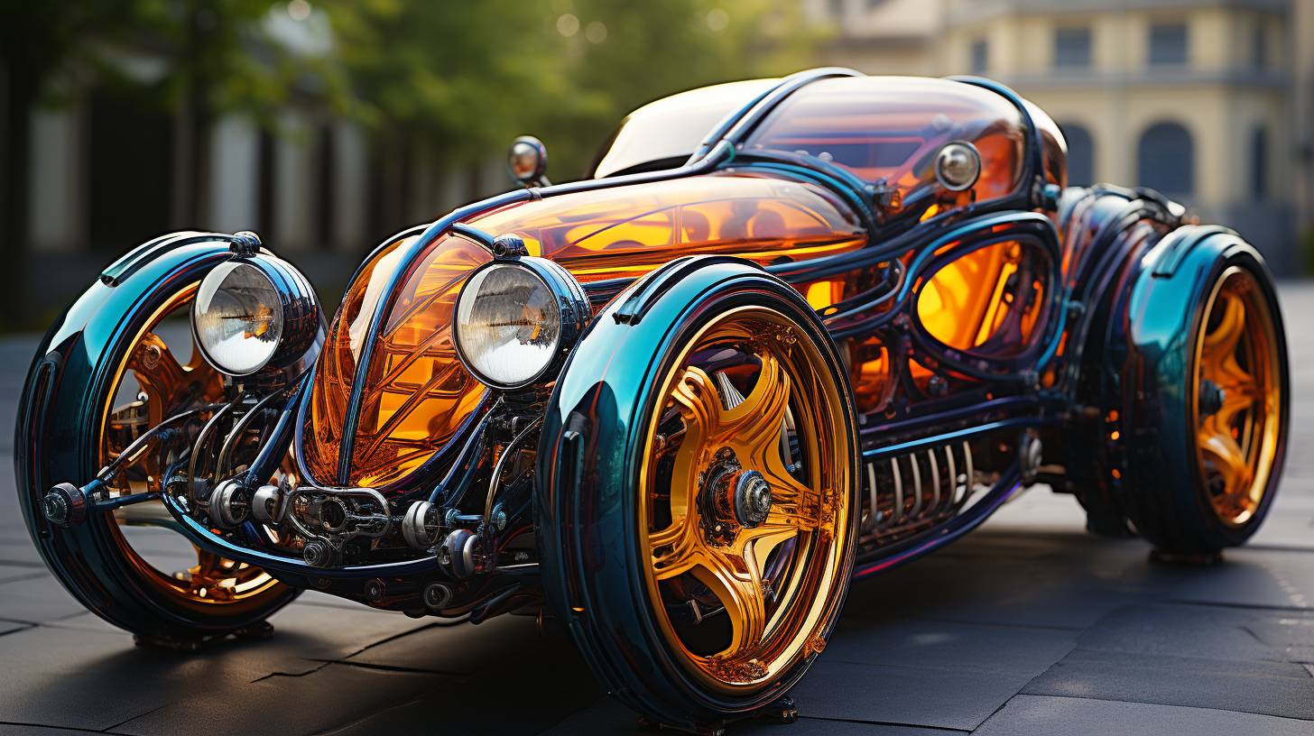 fun art,colorful futuristic LUXURY glass made Farming machinery car and sports car and travel car by steampunk warcraft art by extreme caricature art by Ferrofluid art --s 950 --v 5.2 --style raw --ar 16:9