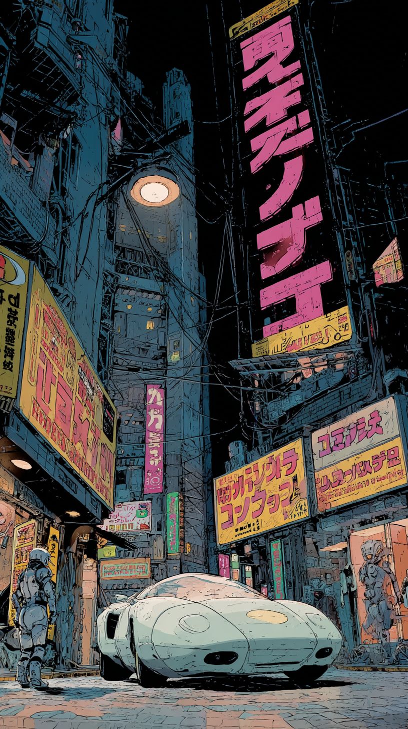 攻殻機動隊のスーパーサイバーガール、日本風、押井守のイラストスタイルの漫画の表紙に「ビデオディスク」というテキスト。未来的な夜のネオ東京の中、ネオンと光に満ちた街、ケーブルであふれ、壁にはケーブルのポスターや破れかけの広告ポスターが貼られている。未来的な車。
