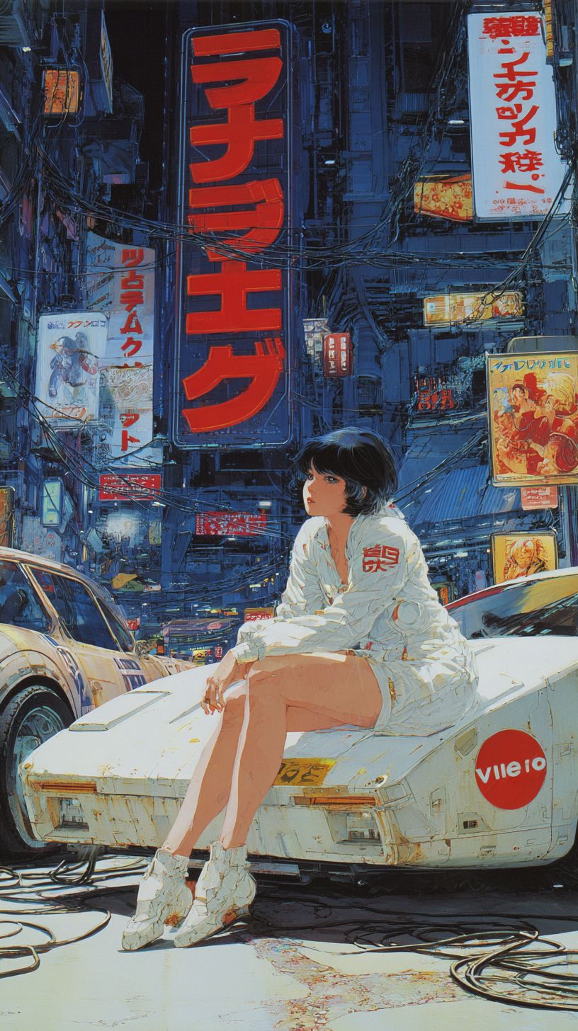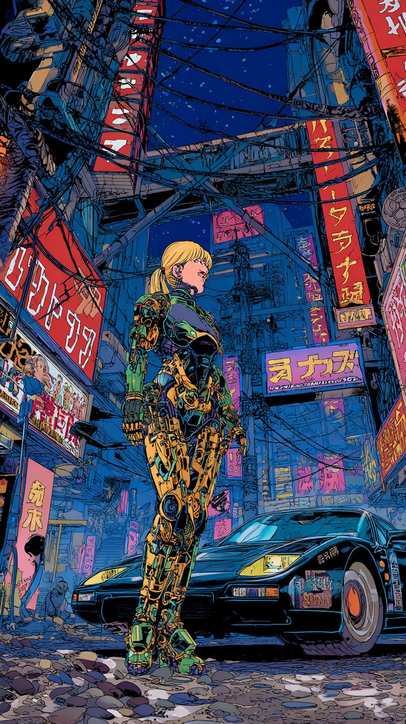 GOST IN THE SHELL SUPER CYBER GIRL , japonesa, al estilo ILUSTRACION de katsuhiro otomo PORTADA PARA manga con texto "ビデオディスク" En medio de futurista neo Tokio DE NOCHE CON NEONES Y LUCES , la ciudad llena de cables, pósters con cables y pósters medio rotos de publicidad por las paredes. Coches FUTURISTAS --ar 9:16 --raw --profile w3xgfsj --stylize 50 --v 7.0