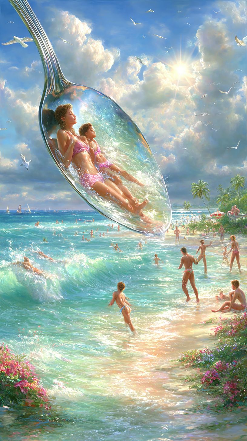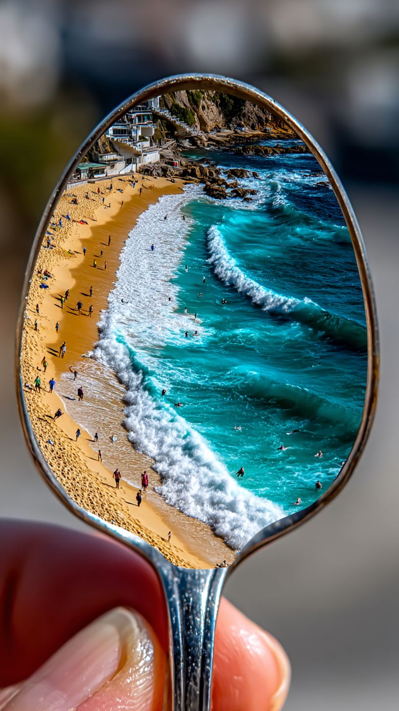 A highly realistic vertical photo of a silver spoon held above a ceramic bowl. Inside the spoon is a vivid tropical beach with soft golden sand, crystal-clear turquoise water, and tiny people swimming and sunbathing. The shoreline curves naturally into the bowl below, where the tropical sea continues with gentle waves, floating clouds, and seagulls flying above. The transition from spoon to bowl feels seamless and magical. Soft sunlight, dreamy atmosphere, 9:16 format, magical realism. --chaos 80 --ar 9:16 --raw --profile 81pkw2c --stylize 550 --v 7.0
