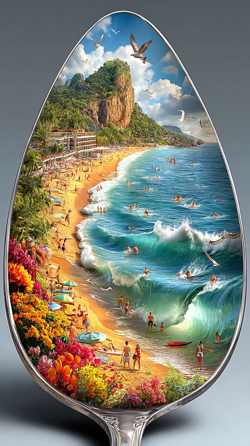 銀のスプーンが陶器のボウルの上に持たれている非常にリアルな縦写真。スプーンの中には、柔らかな金色の砂浜とクリスタルのように透明なターコイズ色の水、泳いで日光浴をしている小さな人々がいる生き生きとしたトロピカルビーチがある。海岸線は自然に下のボウルに曲がり、トロピカルな海が穏やかな波、浮かぶ雲、そして空を飛ぶカモメと共に続いている。スプーンからボウルへの移行はシームレスで魔法のように感じられる。柔らかな日差し、夢のような雰囲気、9:16フォーマット、魔法的リアリズム。