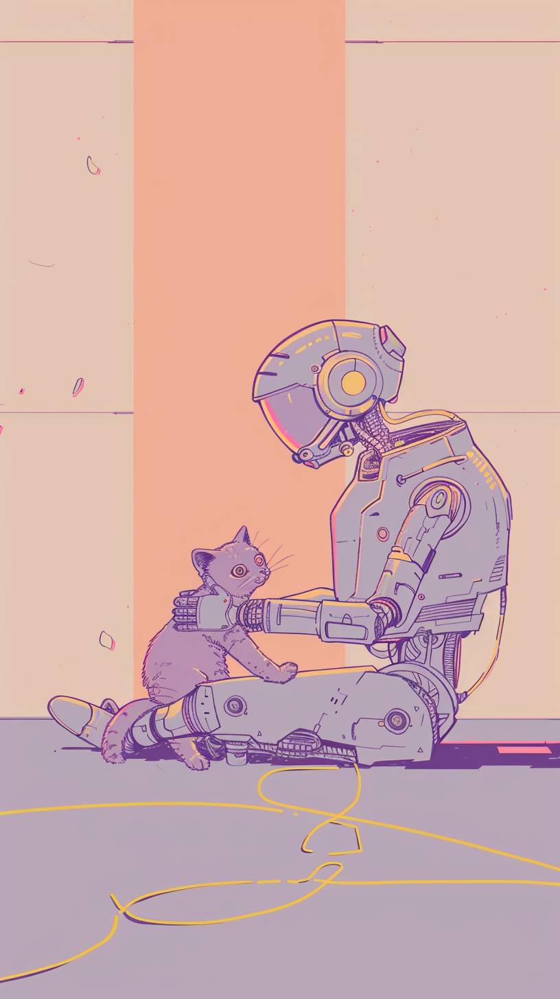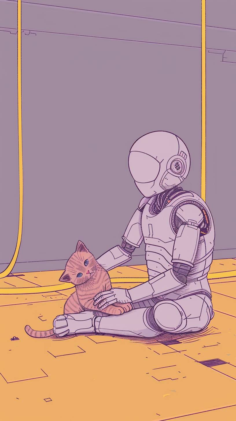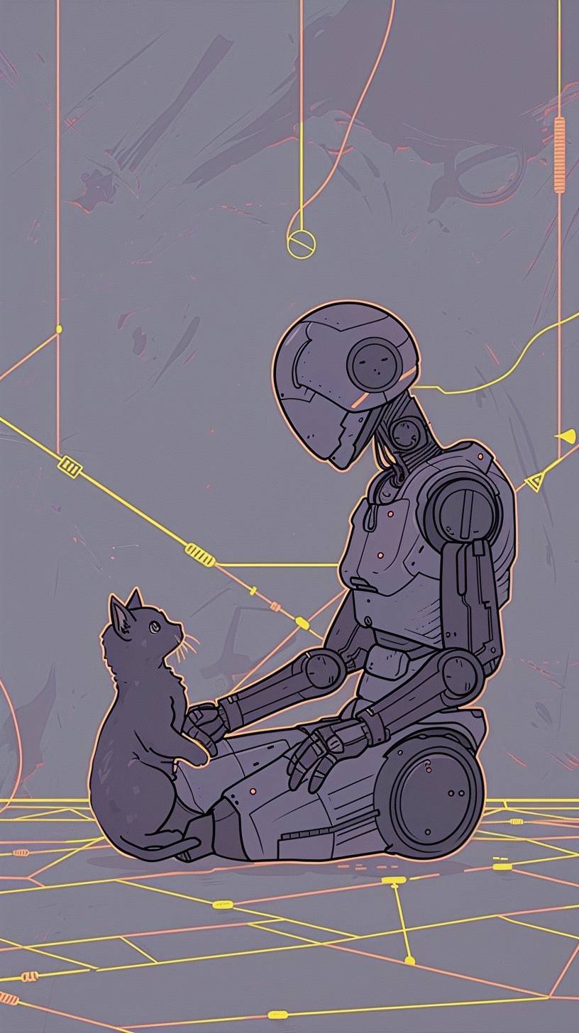 薄紫色の背景に黄色いラインで描かれた、地面に座って子猫を撫でている可愛い小さなディストピアロボット。