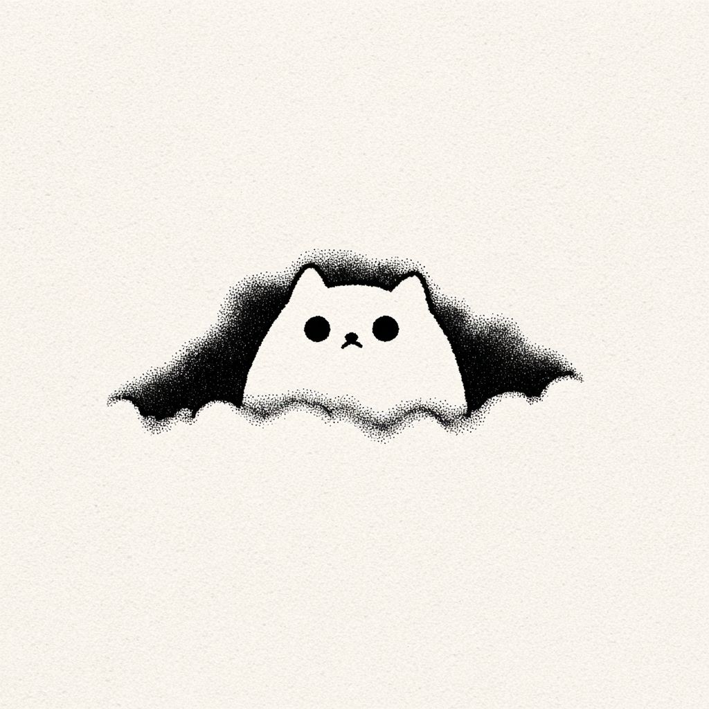 町の空を見上げると、黒いシンプルな線で猫の形が描かれた雲があります。かわいくて遊び心があり、ミニマリストです。
