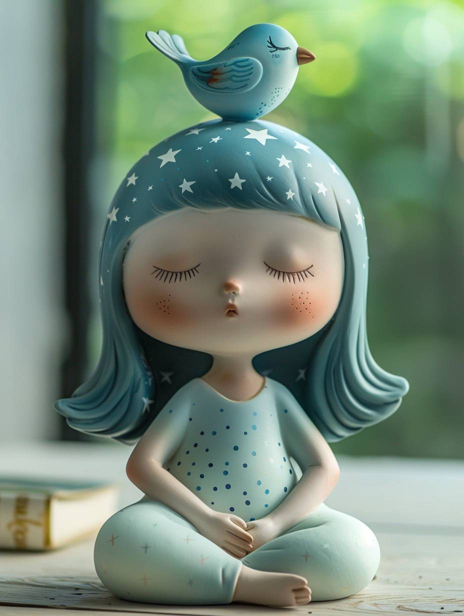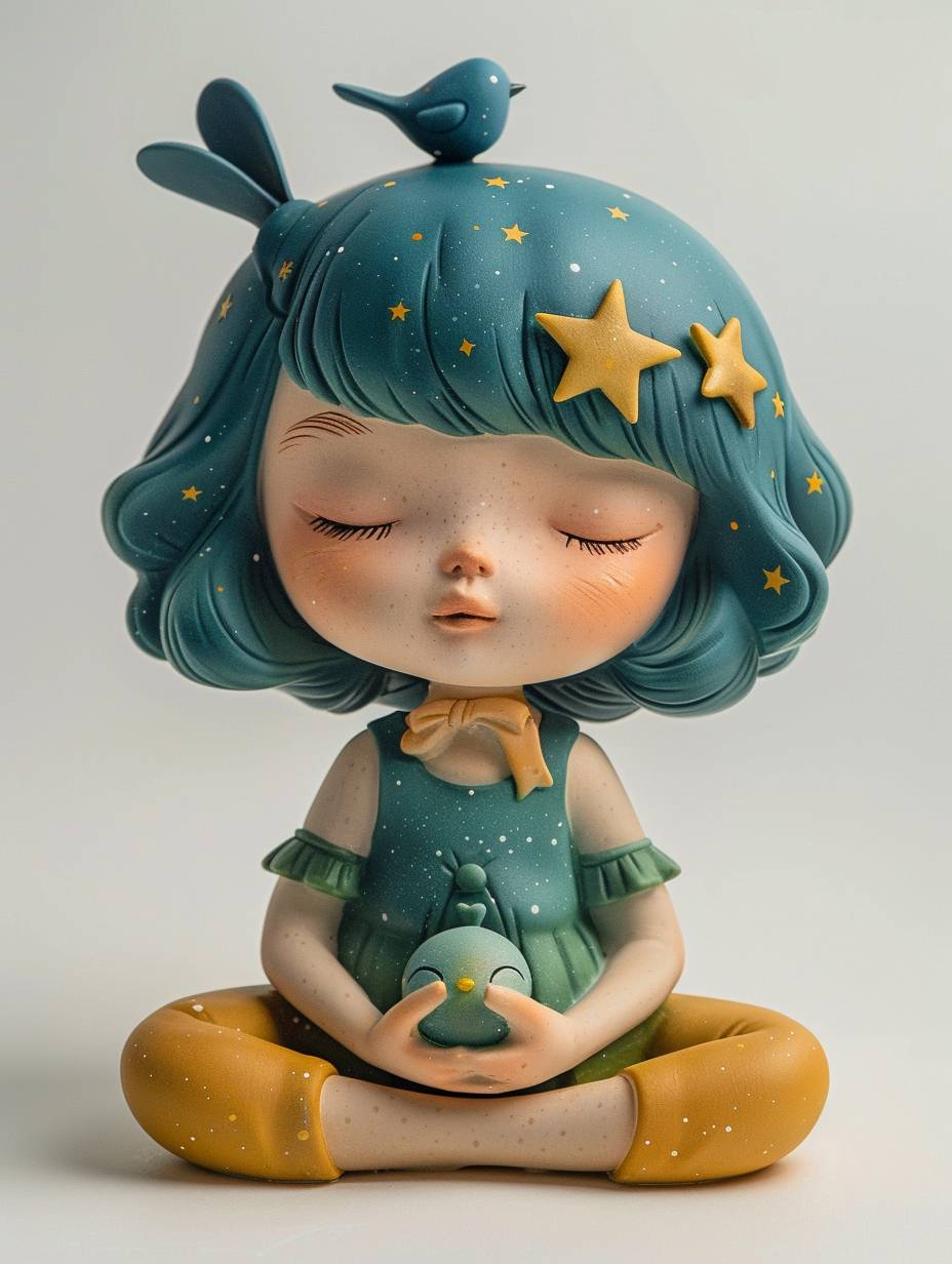 Blind box style vinyl toy of a cute little girl with starry hair and a blue bird on her head with her eyes closed in a meditative pose on a simple white background tilted slightly from The side angle is displayed. The toy adopts a minimalist design with bright colors, high saturation, natural light, soft shadows and exquisite details. Its style is all about natural light, soft shadows and exquisite details --ar 3:4 --stylize 250 --v 6.0
