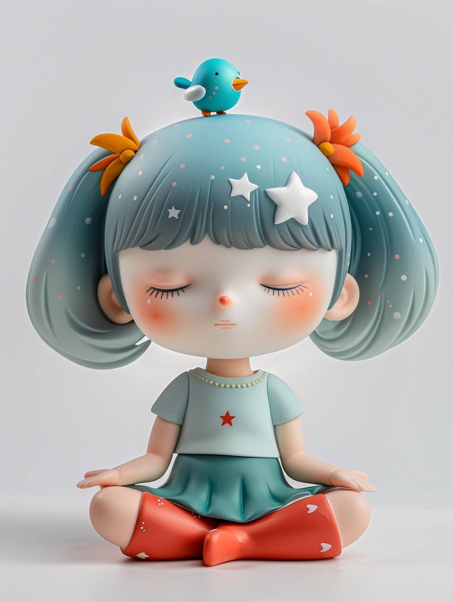 閉じた目で瞑想のポーズをとる、小さな女の子のブラインドボックススタイルのビニールトイ。星のような髪と頭に青い鳥を載せて、背景はシンプルな白で、わずかに横からの角度で展示されています。玩具はミニマリストデザインを採用しており、明るい色、高彩度、自然光、柔らかな影、精巧なディテールが特徴です。そのスタイルは自然光、柔らかな影、精巧なディテールに重きを置いています。