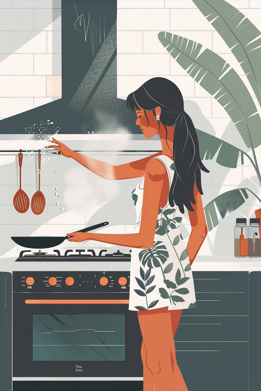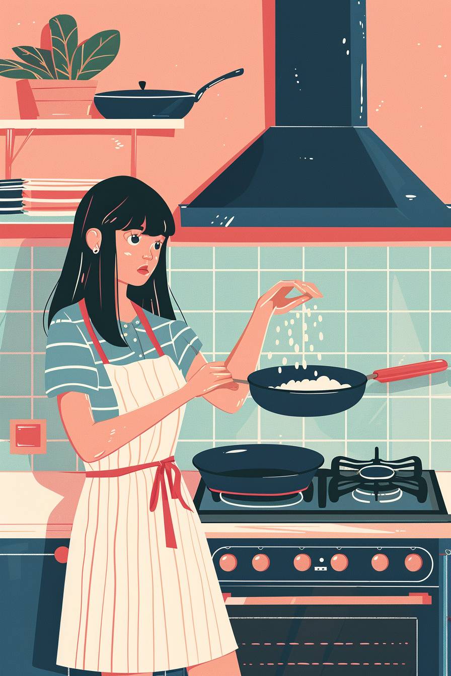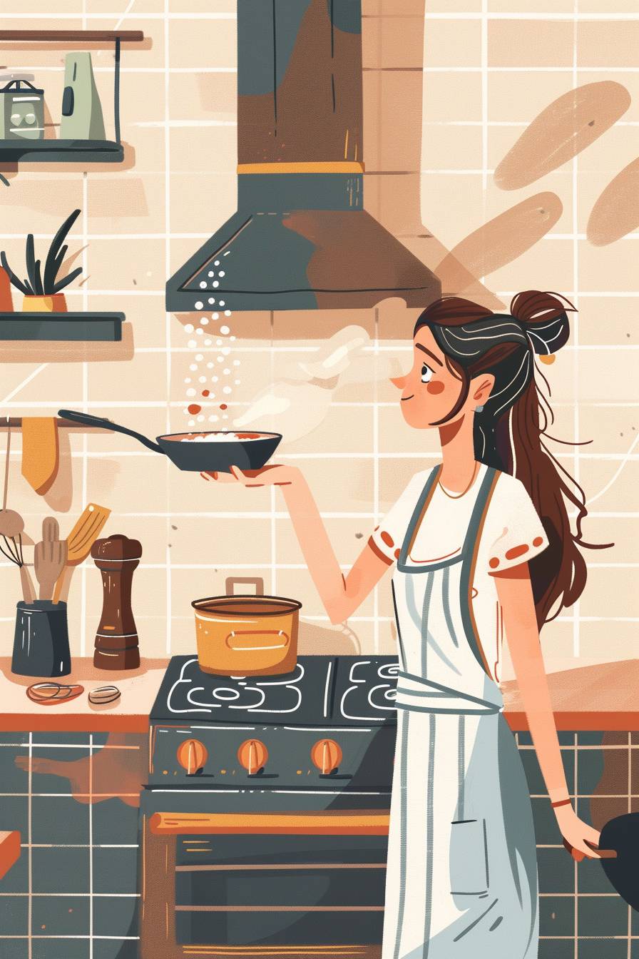女の子、全身、キッチンのガスストーブの上にフライパンを持っています。彼女は右手で鍋を持ち、左手でそれに塩を振りかけています、室内は現代のスカンジナビアスタイルで、平面的でコミックスタイルのイラスト、最小限の線、ソリッドカラー、日常の風景を取り入れ、夏。