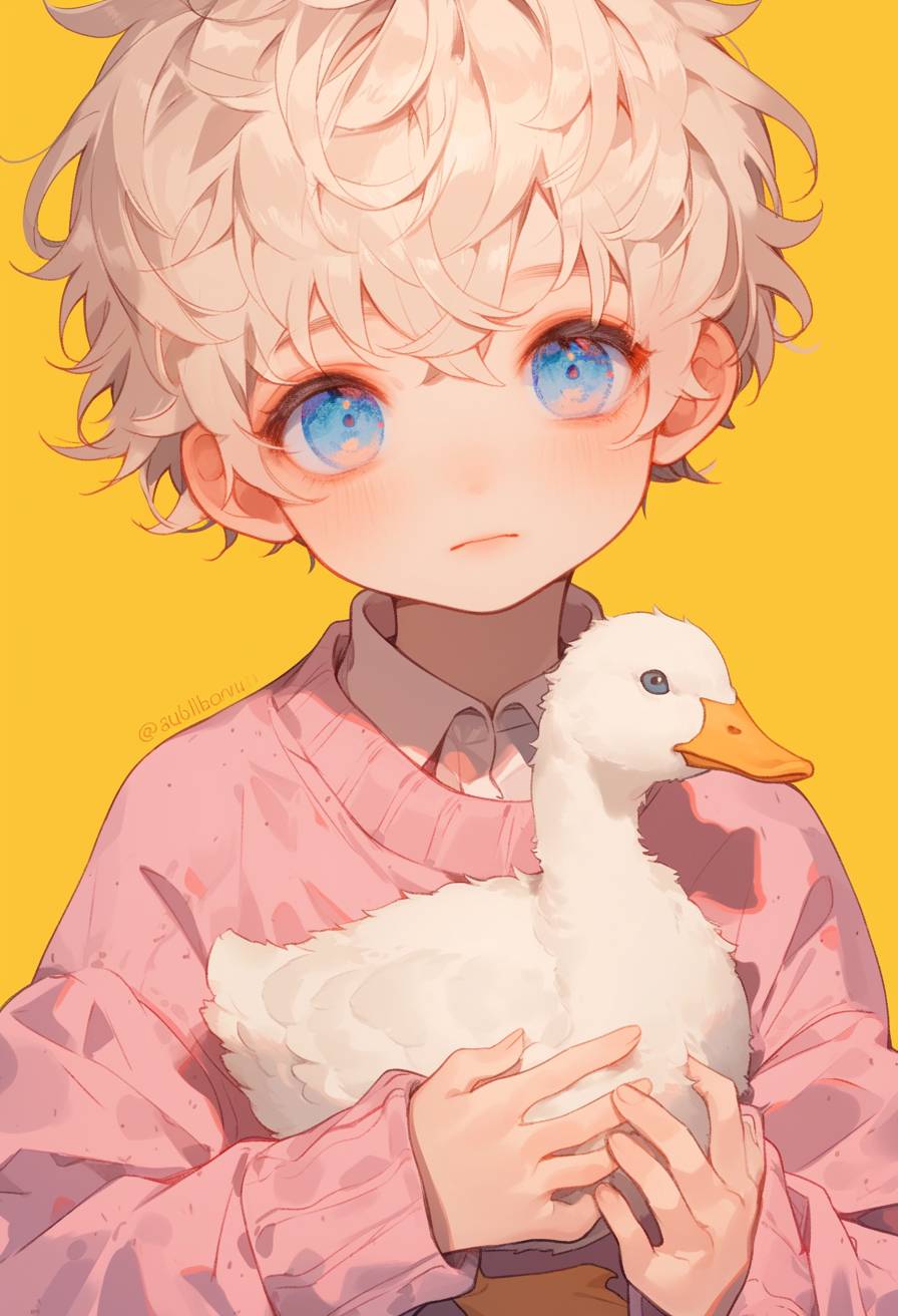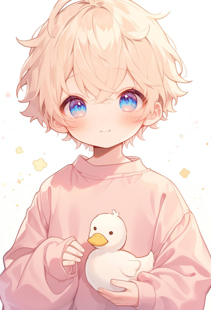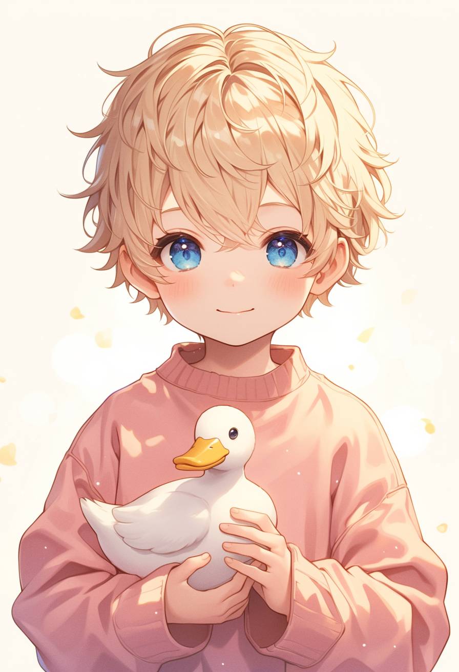 短い髪の毛、青い目、ピンクのセーターを着たかわいい小さな男の子が、手にかわいい白いアヒルを持っている。日本のアニメキャラクターデザインのスタイルで、黄色い背景に小さな点があり、高解像度で、かわいくて夢のよう、詳細な顔の特徴、薄茶色の金色のトーン、高詳細、高品質、高定義。