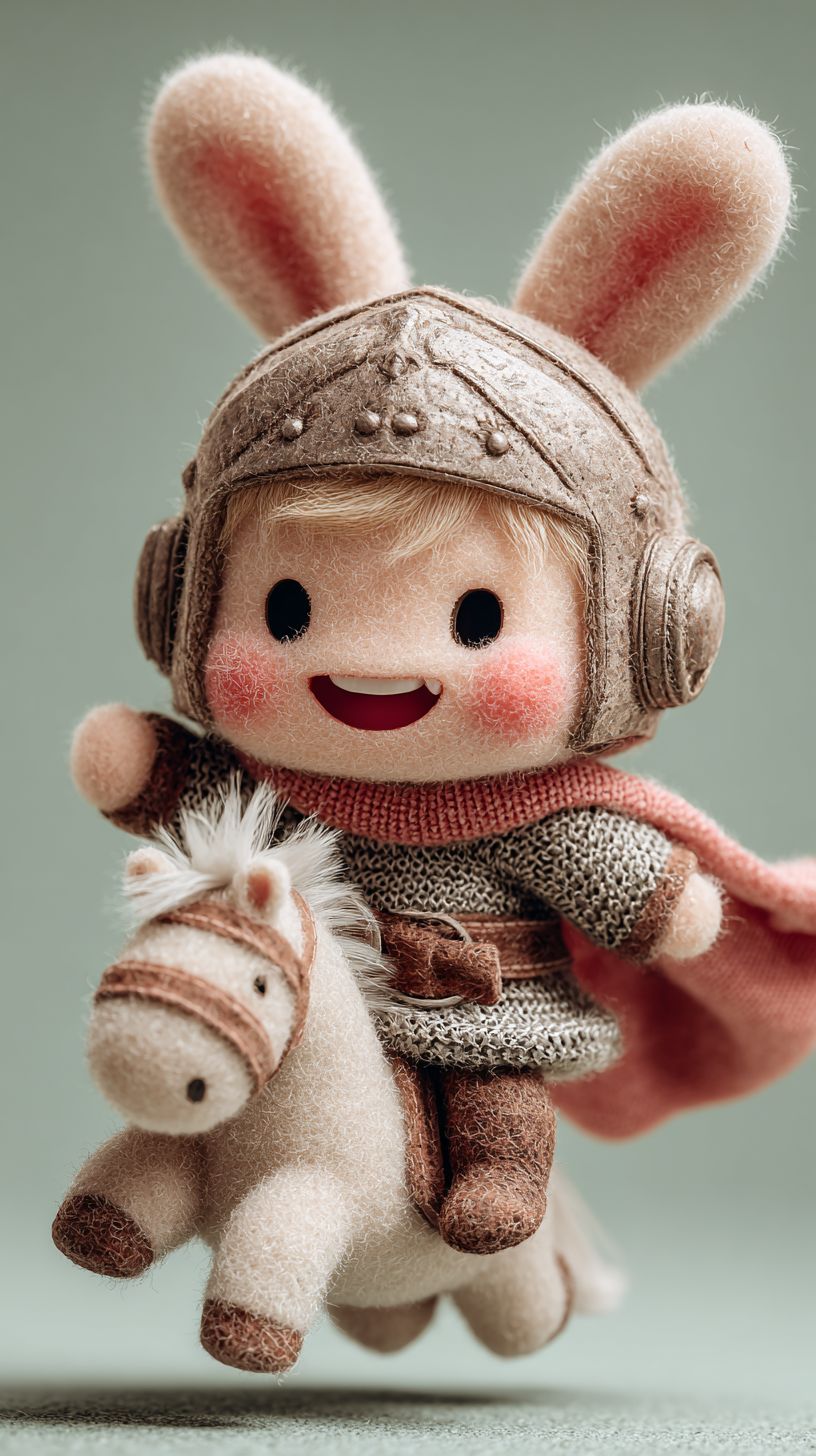 Plush toy material Labubu, Bubble Mart, cartoon style, personified character, rabbit ears, light brown, big eyes, black pupils, 9 pointed teeth, pink cheeks, wearing armor and red cloak, riding a white horse, jumping up. Clean background, authentic texture, rich details, --ar 9:16 --stylize 250 --v 7.0