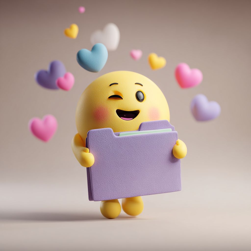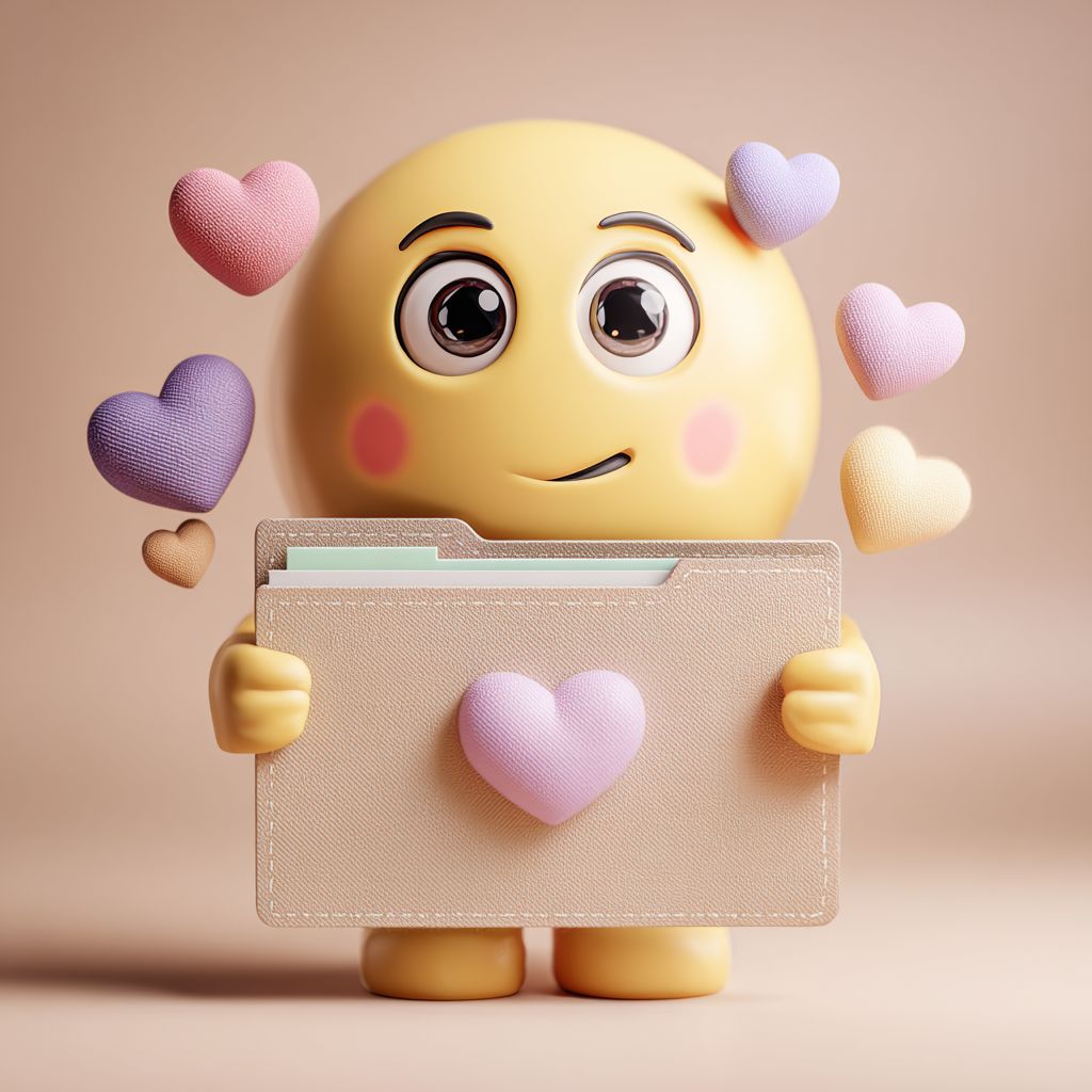 3D emoji holding a beauty-themed folder, floating hearts, wink expression, soft material, pastel tones, minimalism, clay style --chaos 25 --raw --stylize 200