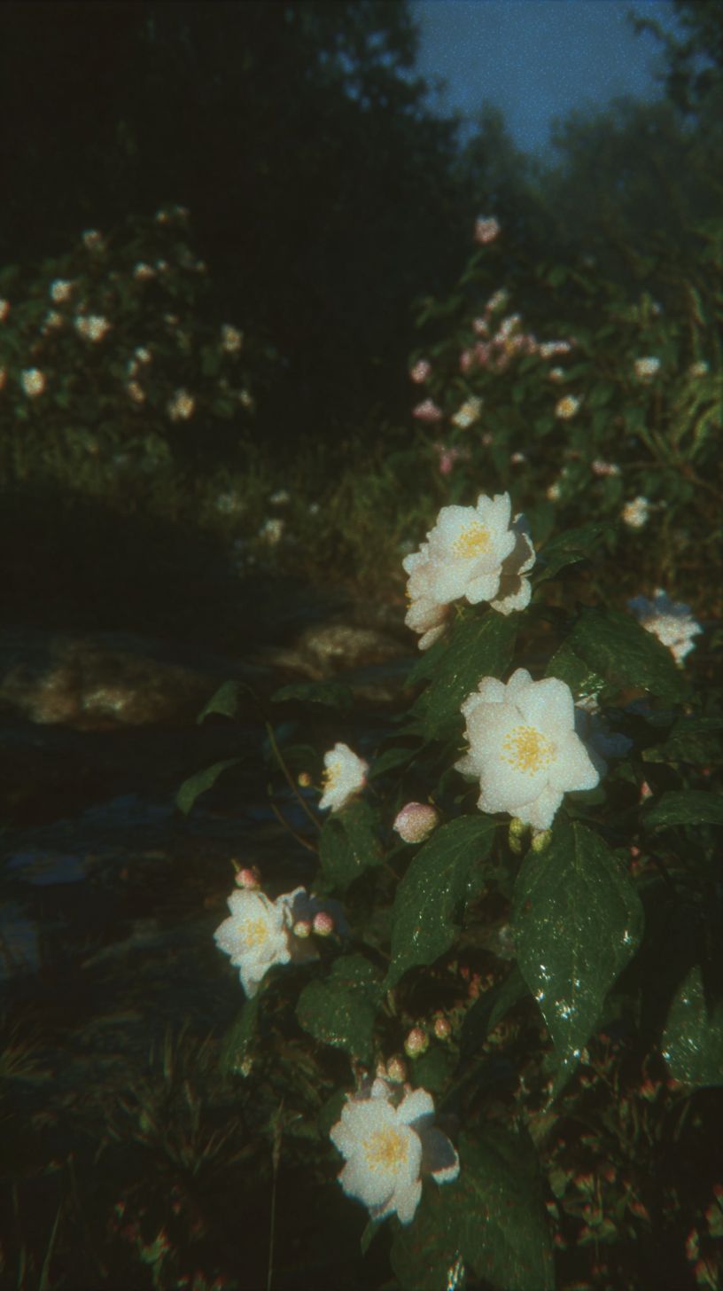 An ultra-realistic professional photograph of a lush jasmine garden in full bloom, filled with delicate white jasmine flowers surrounded by rich green foliage. The air feels humid and fresh, with subtle morning dew visible on the petals and leaves. The garden path is partially shaded, with soft natural light filtering through nearby trees. The flowers are sharply in focus, showing fine texture on the petals and slight translucency in the light. Some unopened buds are still visible among the full blossoms. The background fades into a gentle bokeh of more jasmine and leaves, creating depth and serenity. Hyper-realistic floral textures, soft natural shadows, ultra-sharp detail, HDR, captured with an 85mm lens, f/1.8, golden hour light or soft morning light, no CGI, no illustration, photography-level realism, professional editorial style --ar 9:16 --profile gu23rmv --stylize 500
