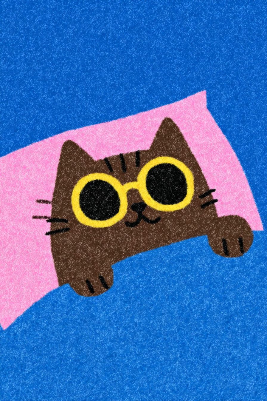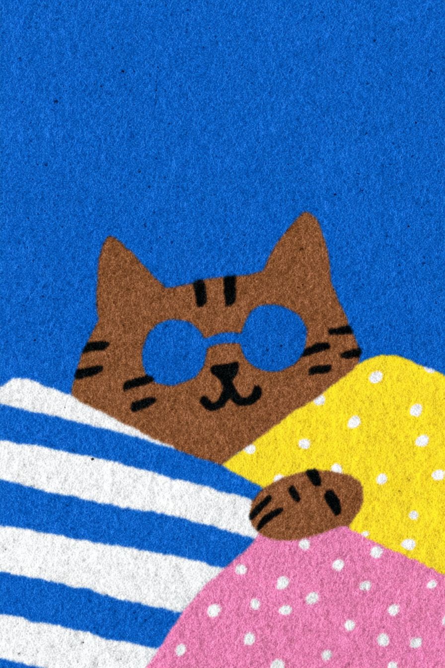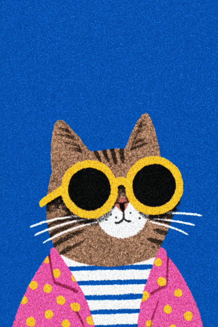 サングラスをかけたブラウンカラーのアメリカンショートヘア猫が、快適な夏の服を着て楽しげなイラストスタイルを見せている