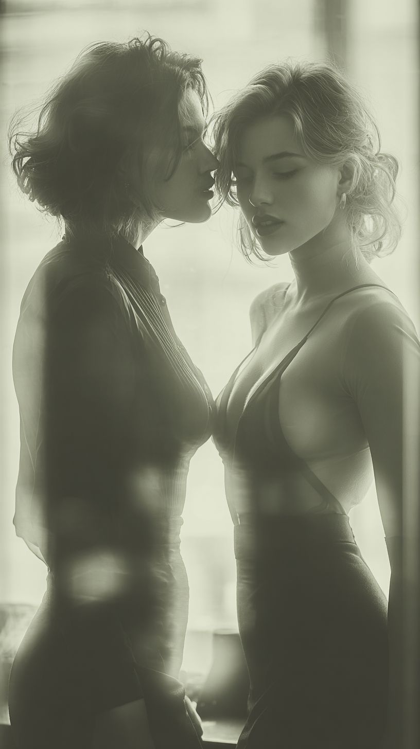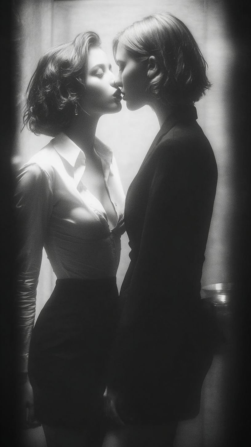 two abstract attractive women, corporate style wear, kissing in office, luxury modern meeting room, after work, hidden camera monochrome photo style --ar 9:16 --s 750