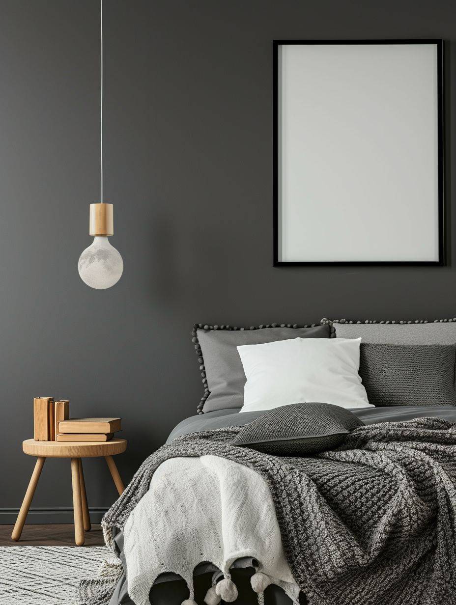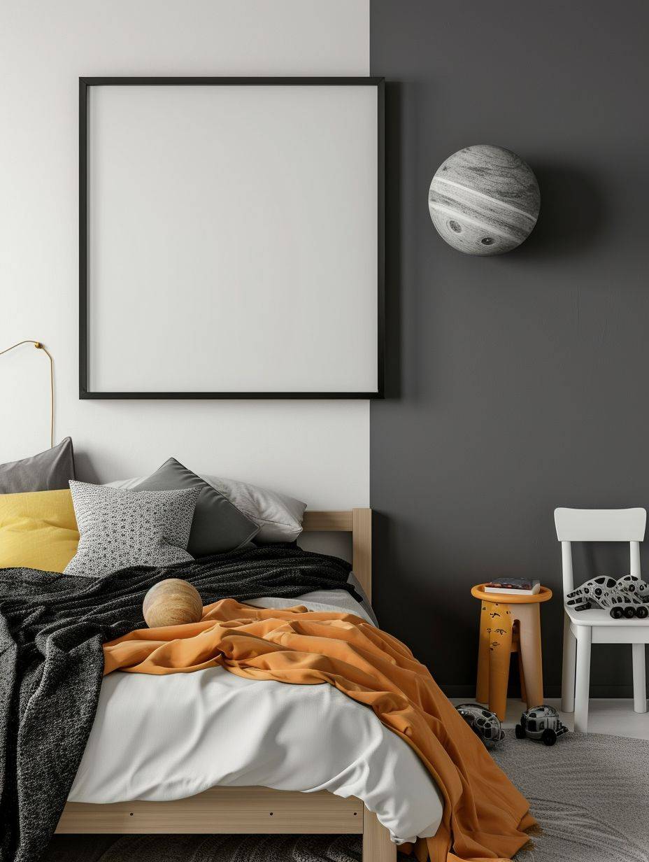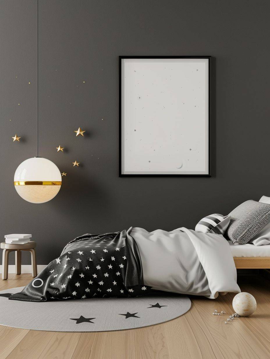 子供のモダンな寝室、ベッド、壁にあるモックアップフレーム、宇宙テーマ、黒とグレーのスタイル