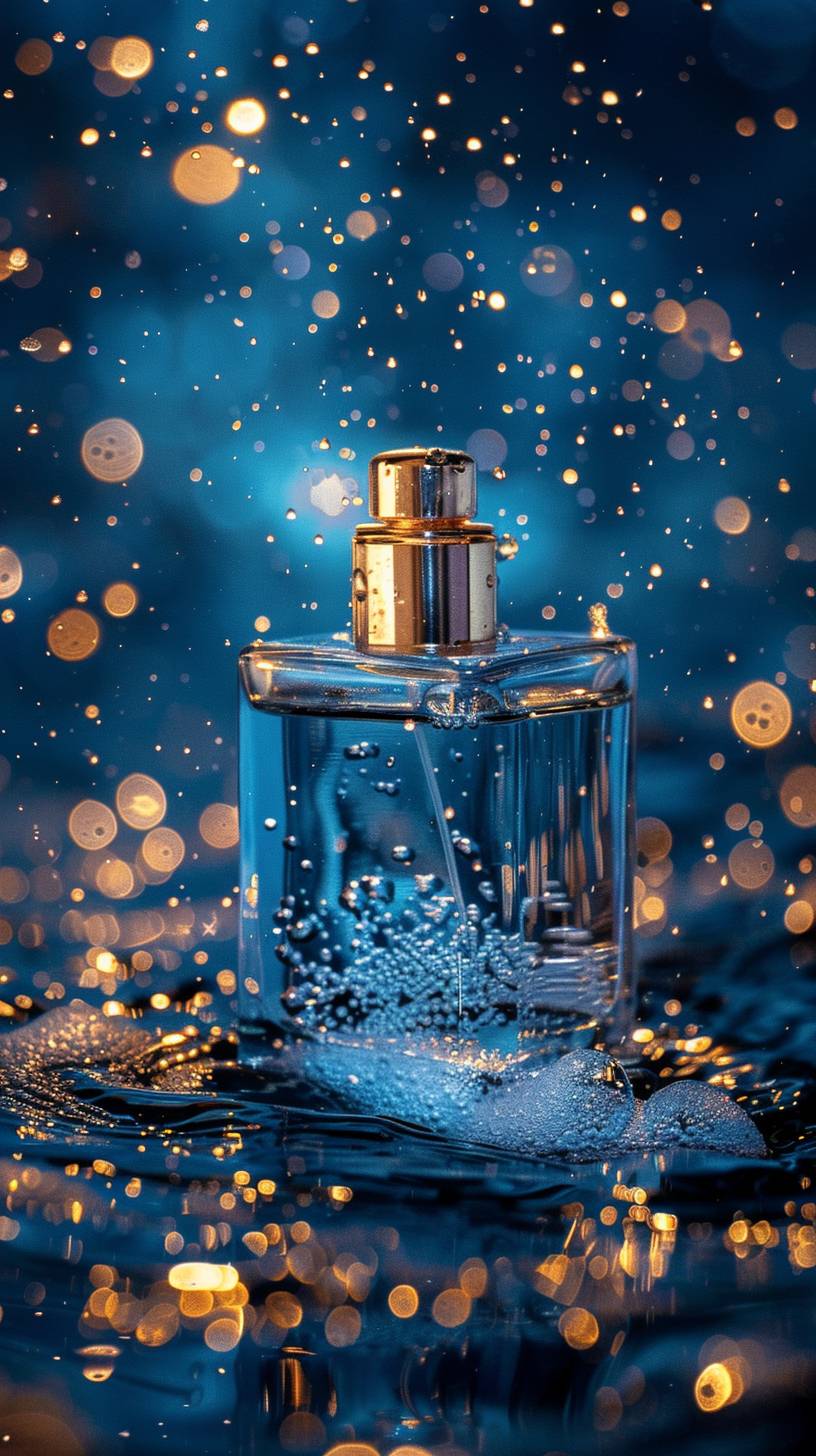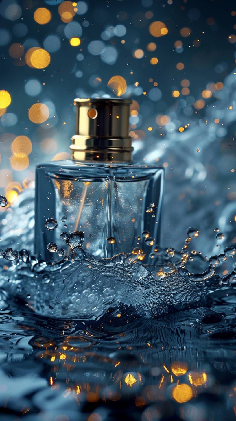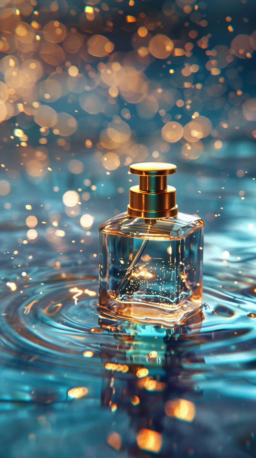 水の上に香水があり、金と青の色合いで魔法のような贅沢さを持ち、静止した水です。