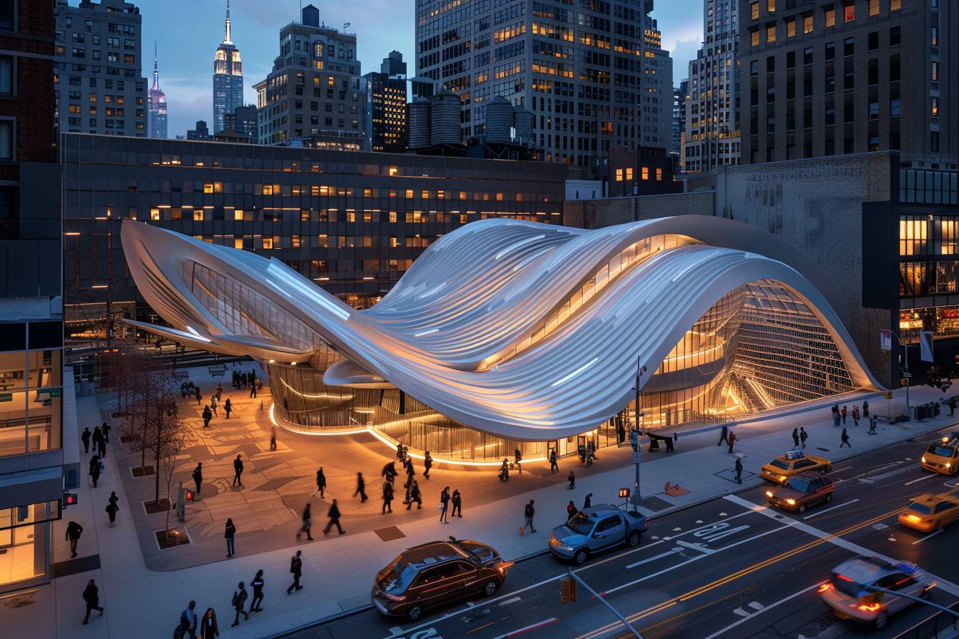ハーレムグランドセントラル駅の入口は、サンティアゴ・カラトラバのスタイルで白い曲線状になっており、鳥瞰図、浮遊する構造、豪華な設定があります。