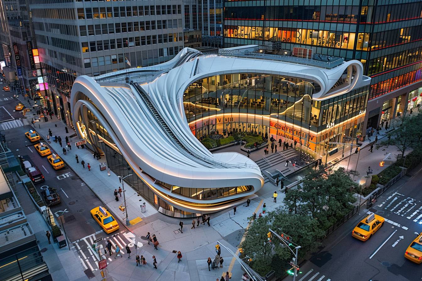 ハーレムグランドセントラル駅の入口は、サンティアゴ・カラトラバのスタイルで、白く曲がりくねった形をしており、バードアイビュー、浮遊する構造、豪華な設定、ストライプがあります。