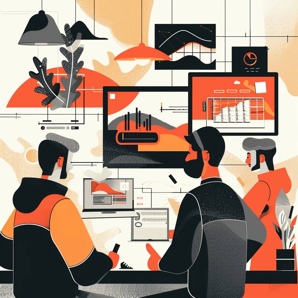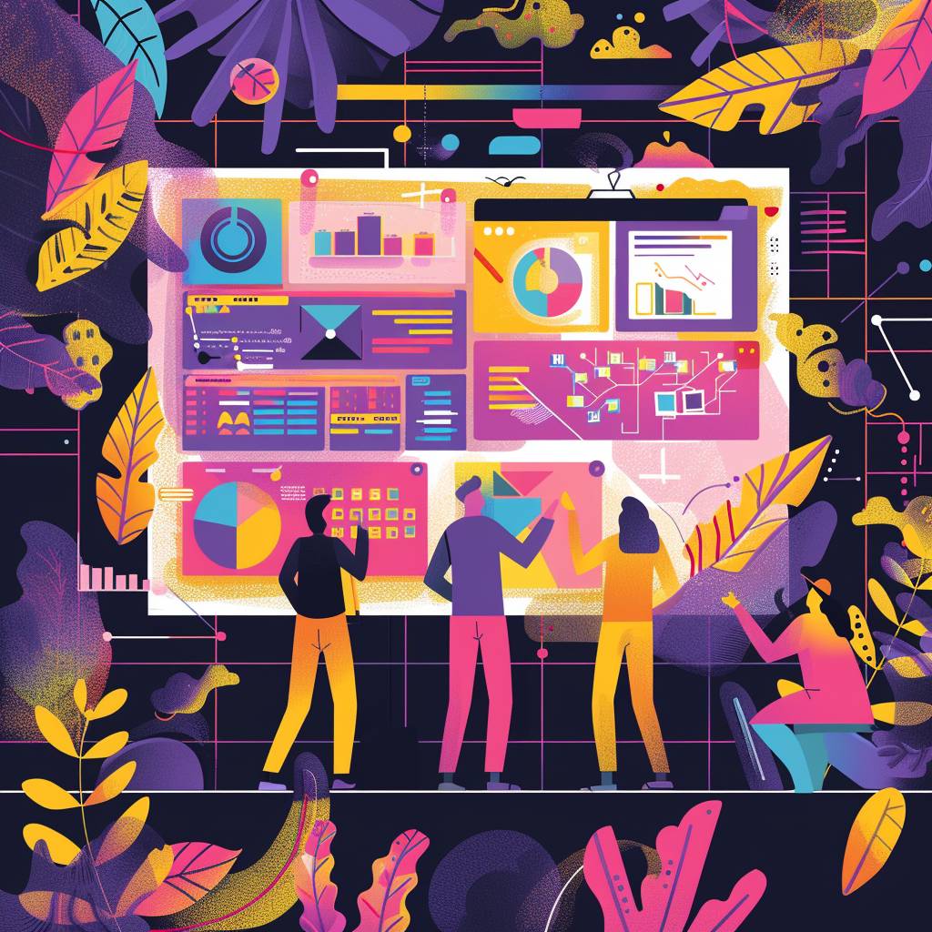 技術ブログのために、チームがプレゼンテーションを行っている清潔なベクターイラストレーション、興味深い構成。