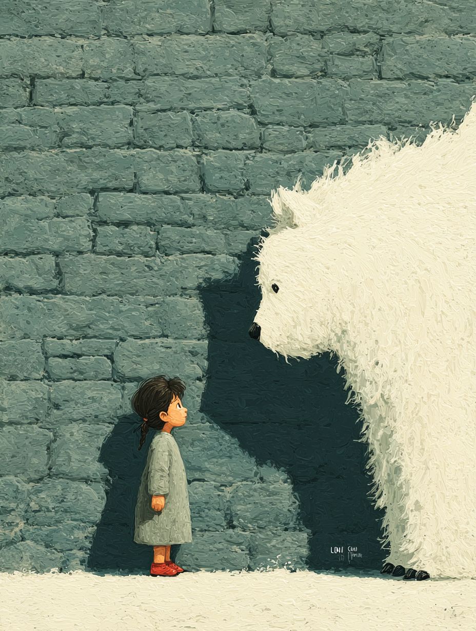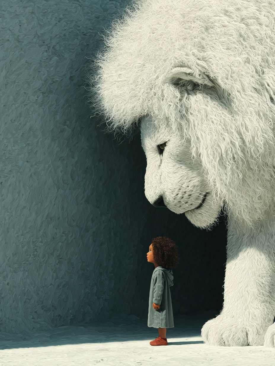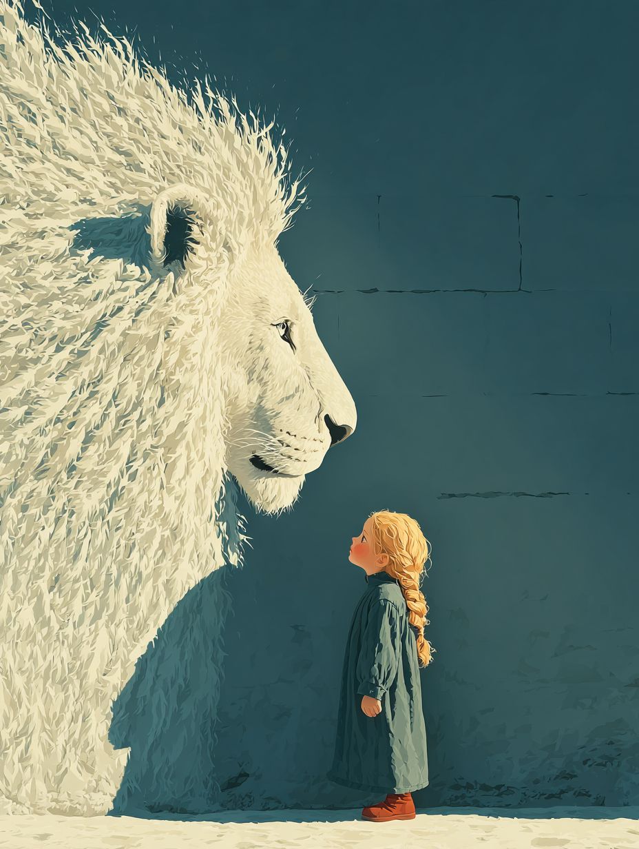 A little girl in a gray dress standing next to her gray lion's shadow, a fluffy white wall behind them. A cute illustration for children in the style of Hergé and Goro Fujita, with simple flat colors and a black background, and white fur. --ar 3:4 --s 750