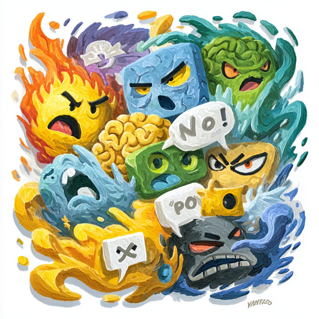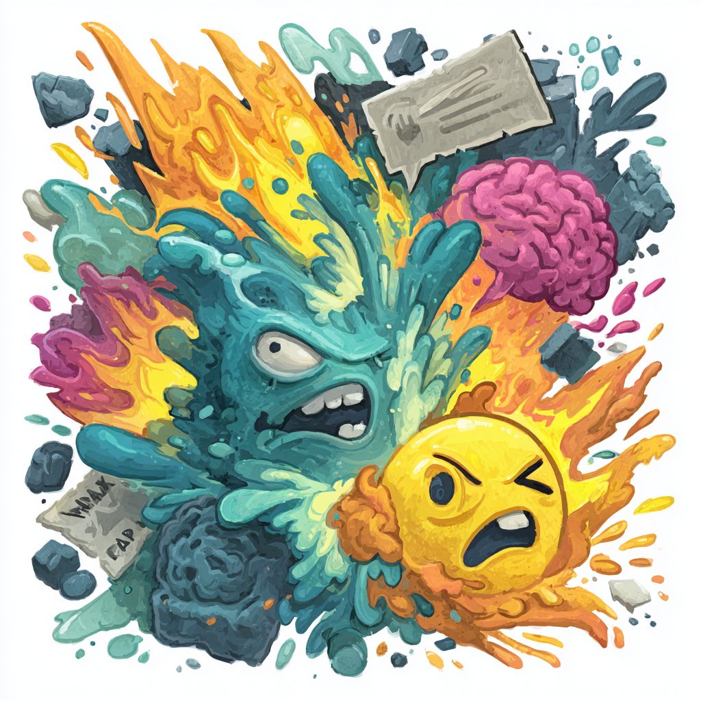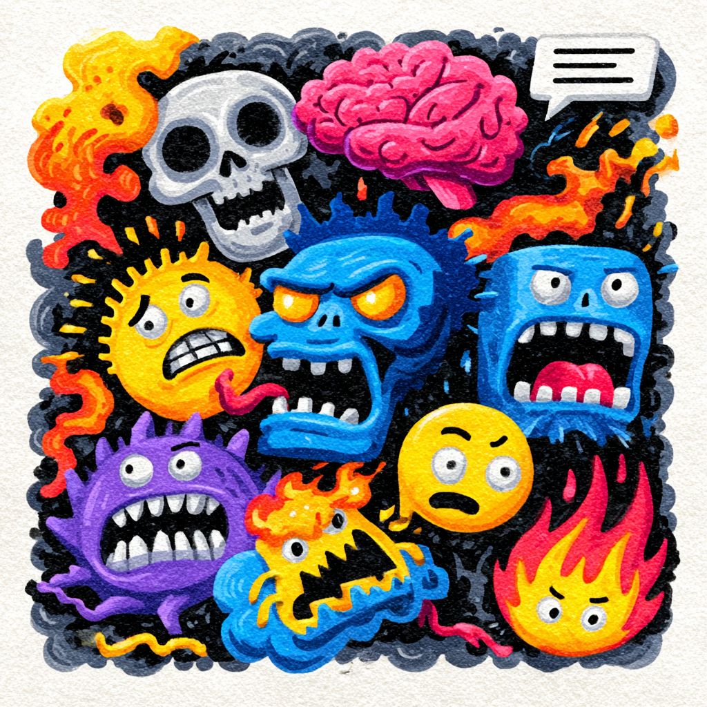 脳、火、チャットバブル、ノーキャップ絵文字、めまい顔を含む絵文字の渦、カラフルなカートゥーンスタイルで表現された、若者文化のエネルギー、ステッカー美学、渦巻く動き、白い背景、テキストなし
