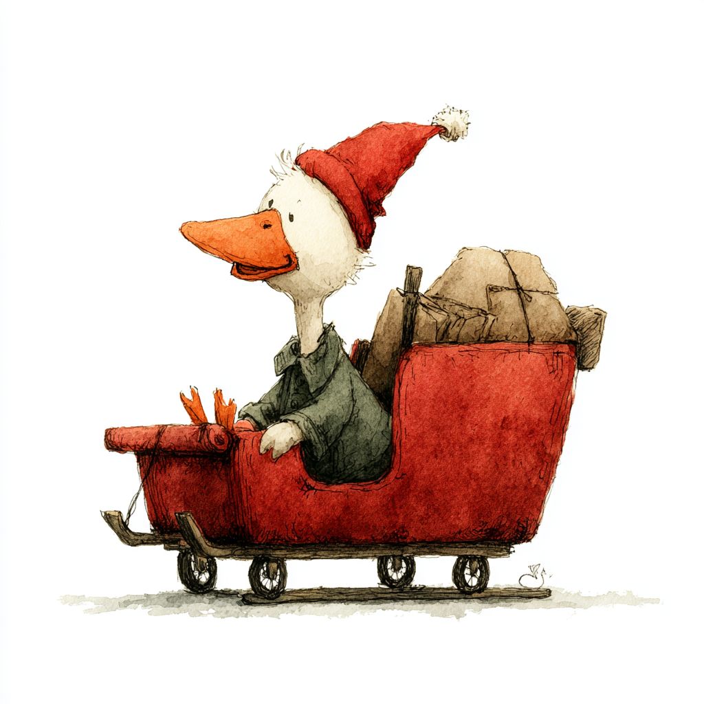 simple watercolor illustration of a Cute Christmas Goose in a Santa hat riding a red Christmas sleigh, in the style of Jon Klassen, cottage core isolated on a white background, minimal style, soft colors, children's book aesthetic, no shadows --s 750