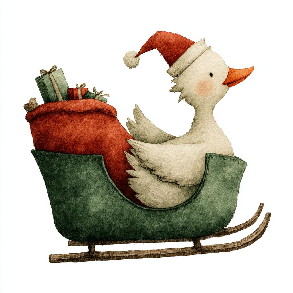 かわいいクリスマスのガチョウがサンタ帽をかぶって赤いクリスマスソリに乗っているシンプルな水彩イラスト。ジョン・クラスセン風のスタイルで、白い背景に田舎の雰囲気、ミニマルなスタイル、柔らかい色合い、子供の本の美学、影なし