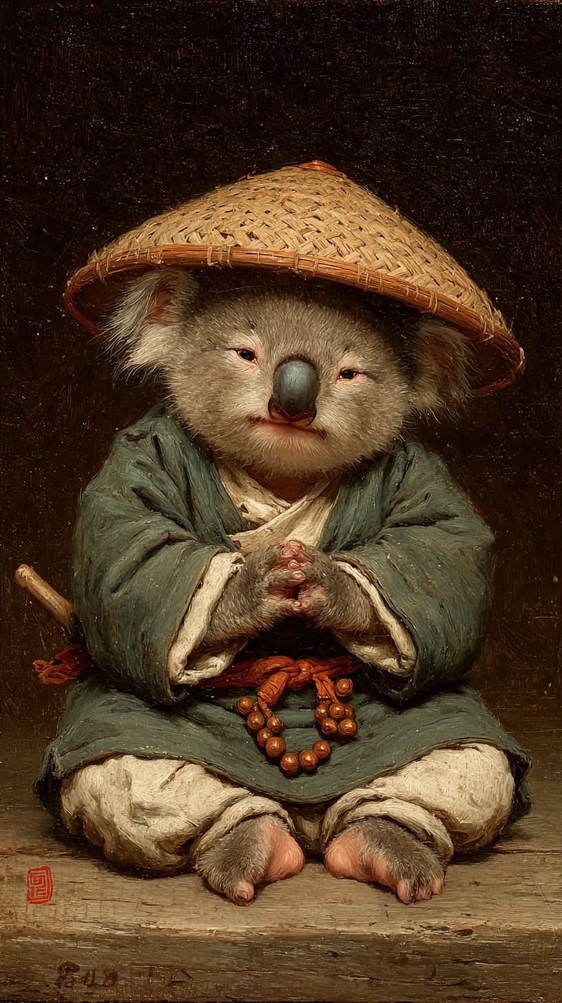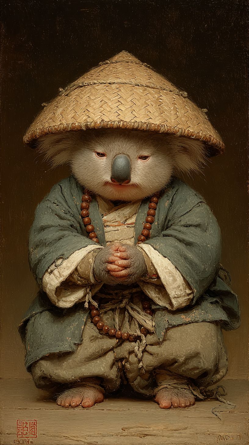 細かい筆致の小さなコアラ、正面からの視点、バンブーハットをかぶり、全身のクローズアップ、あぐらをかいて座り、僧侶の服を着て、仏教の数珠を持ち、手を合わせている、かわいく、古代中国風。