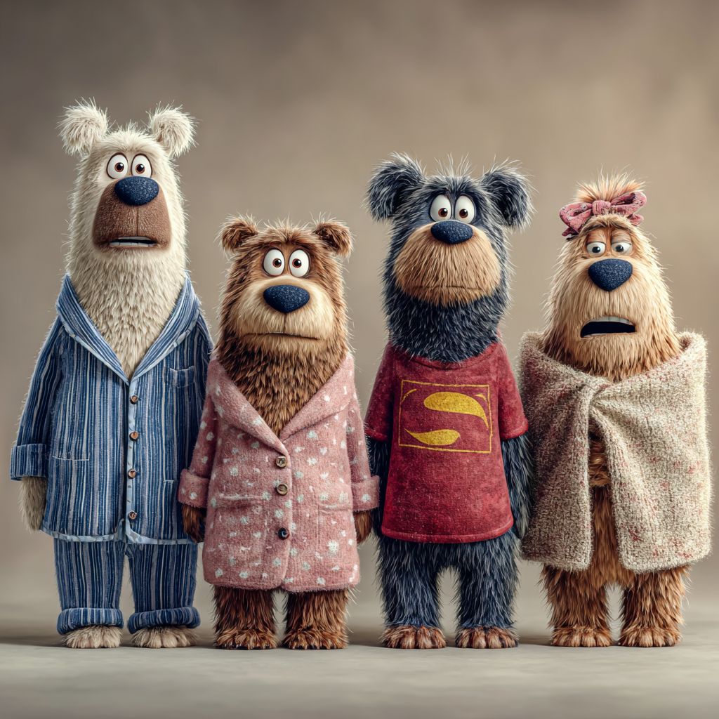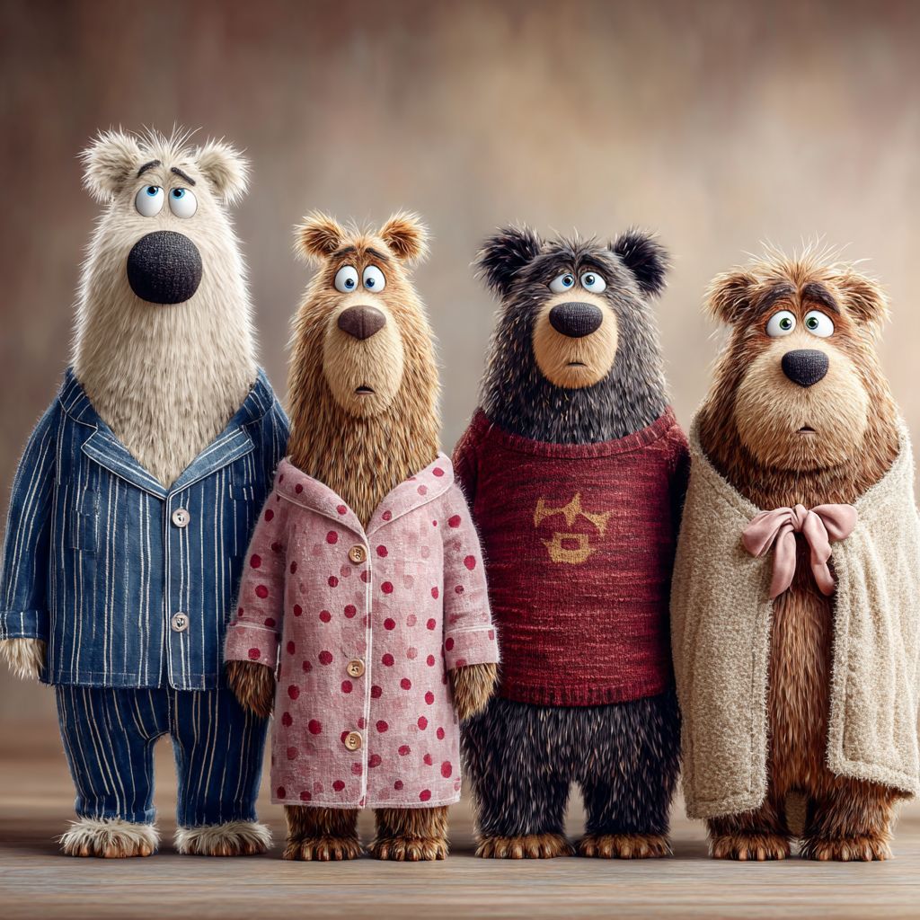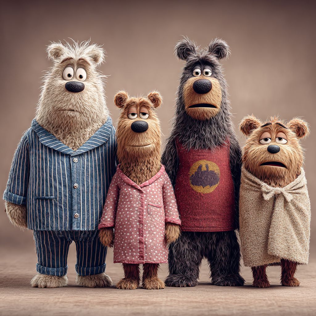 面白いカートゥーンのクマの家族、4匹のクマが3Dピクサー-ドリームワークススタイルで、全身を揃えて肩を並べて立っています。父クマは白い毛皮で青いストライプのパジャマを着ていて、母クマは薄茶色の毛皮でピンクの水玉のナイトgownを着ています。男の子のクマは濃い毛皮で赤いスーパーヒーローTシャツを着ており、恥ずかしがり屋の女の子のクマはベージュの毛皮でブランケットとリボンを持っています。リアルな毛、表情豊かな顔、高品質のライティング、中立的な背景、キャラクターデザインの参考。