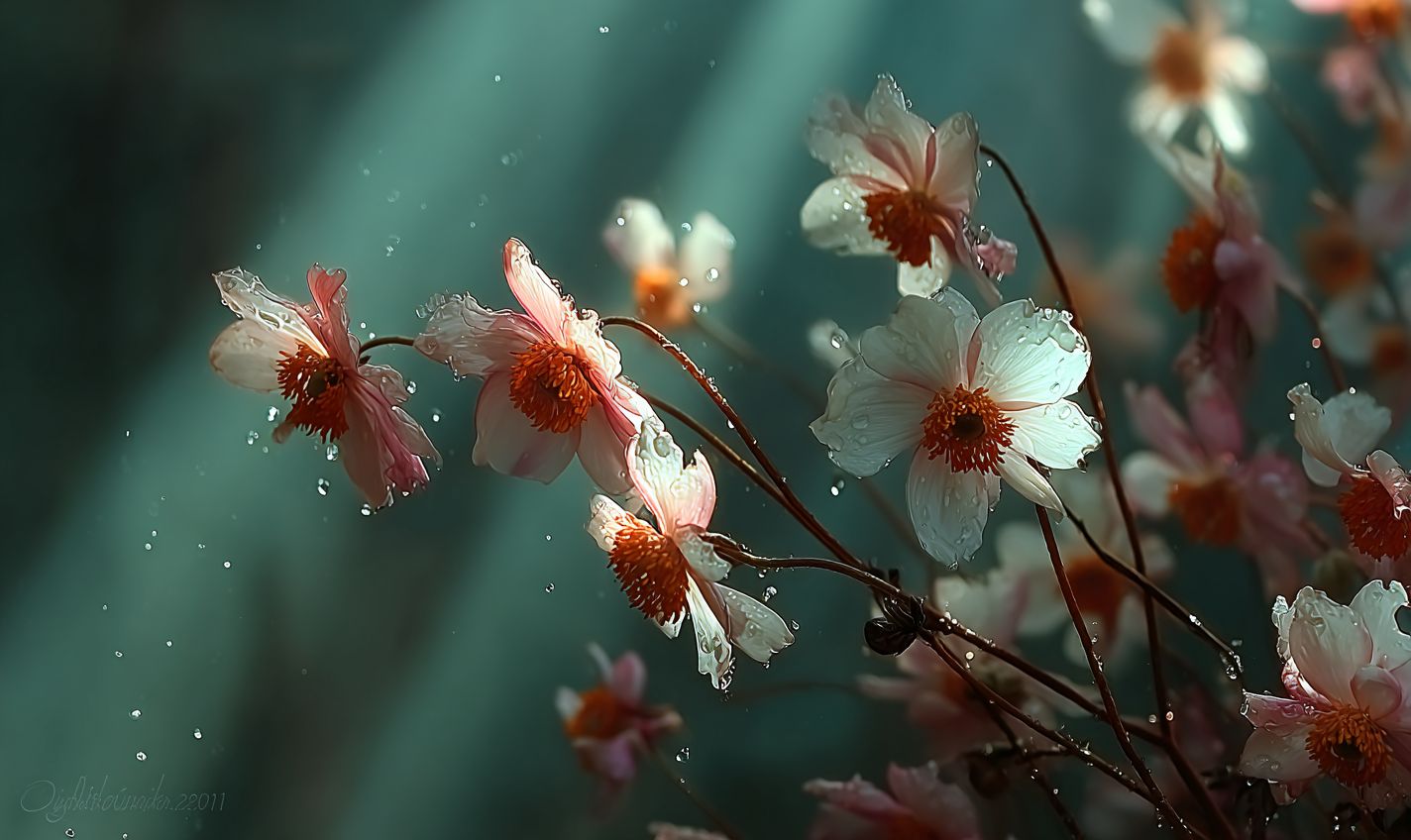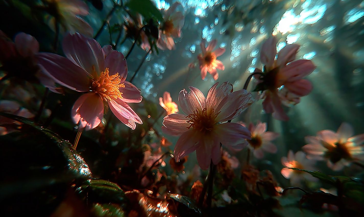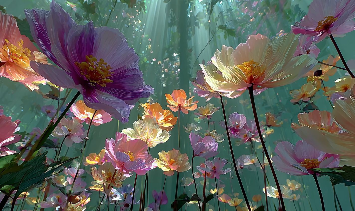 陽光の下で色とりどりの花が光の中で揺れ、底部で光と影の効果が生まれる