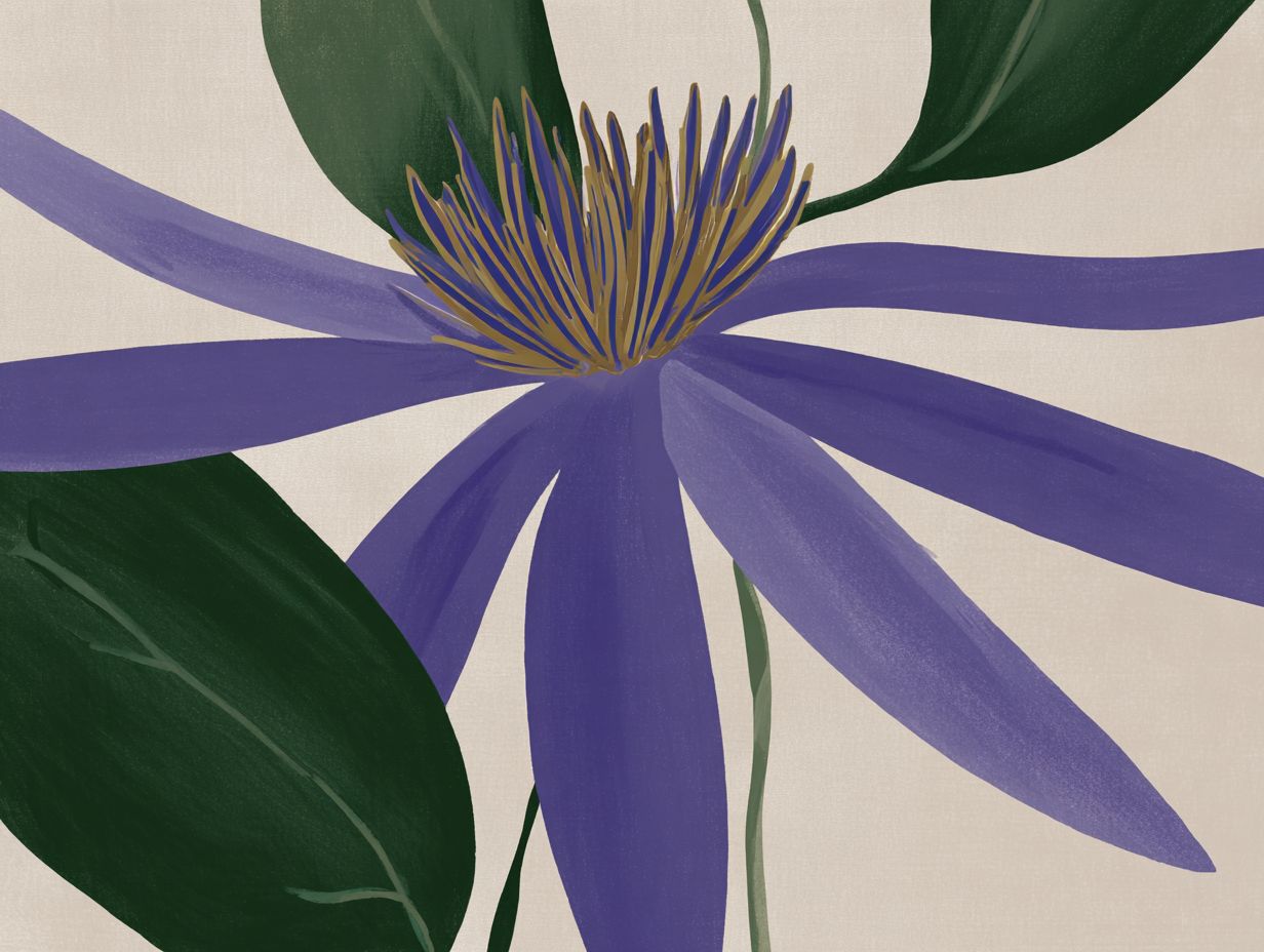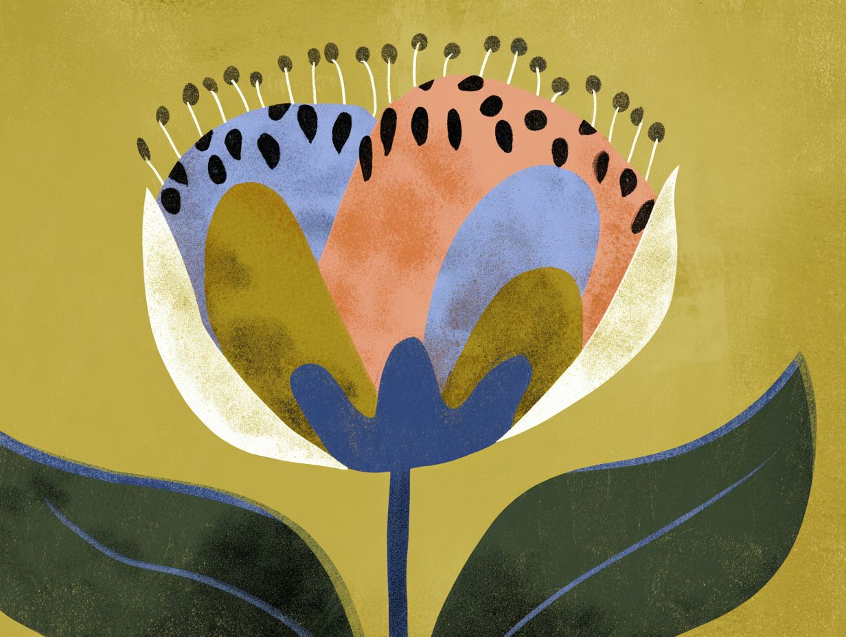 これは、オーガニックスタイルの花のクローズアップを特徴とした、遊び心あふれる民俗イラストです