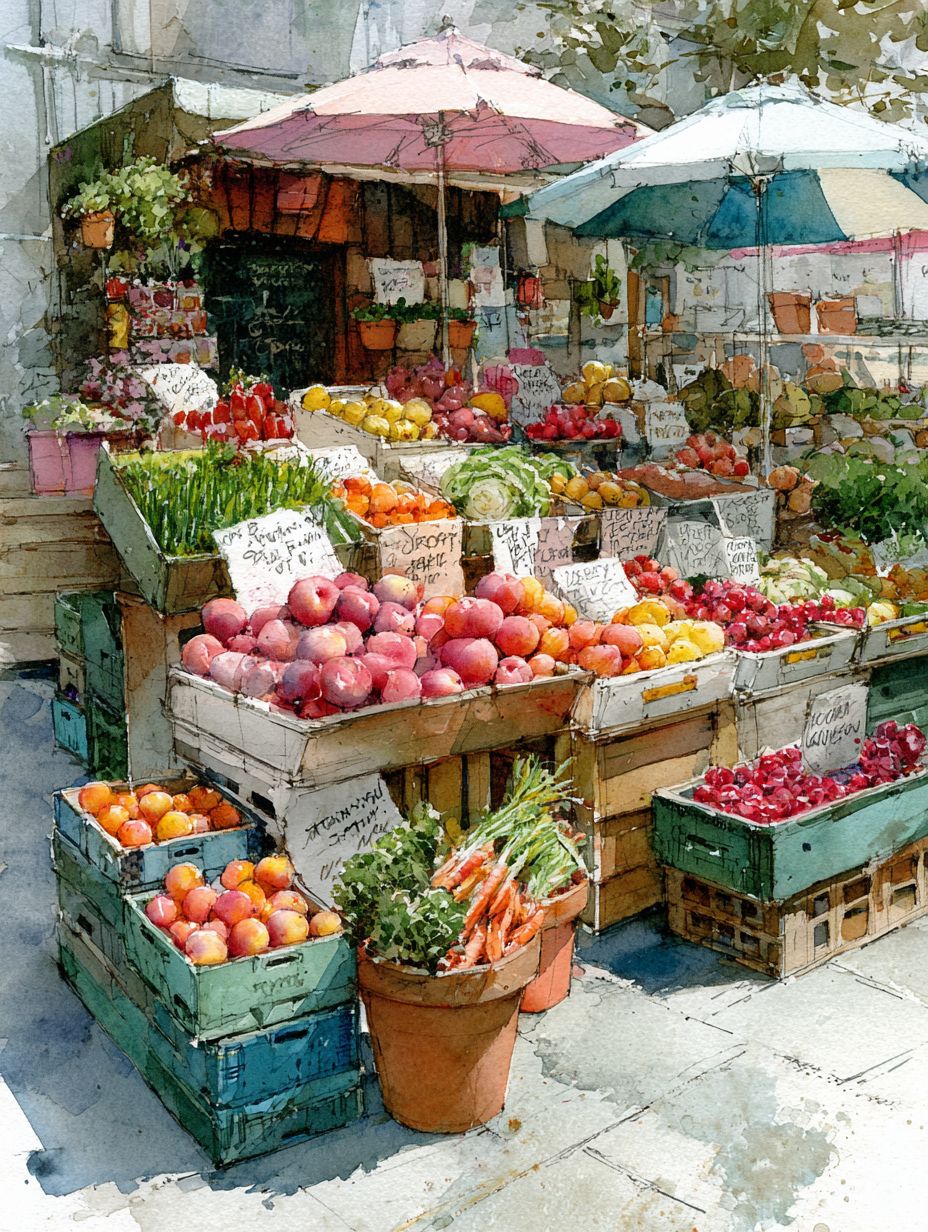 ニューヨークのユニオンスクエアグリーンマーケットの水彩画、新鮮な果物と野菜が溢れている