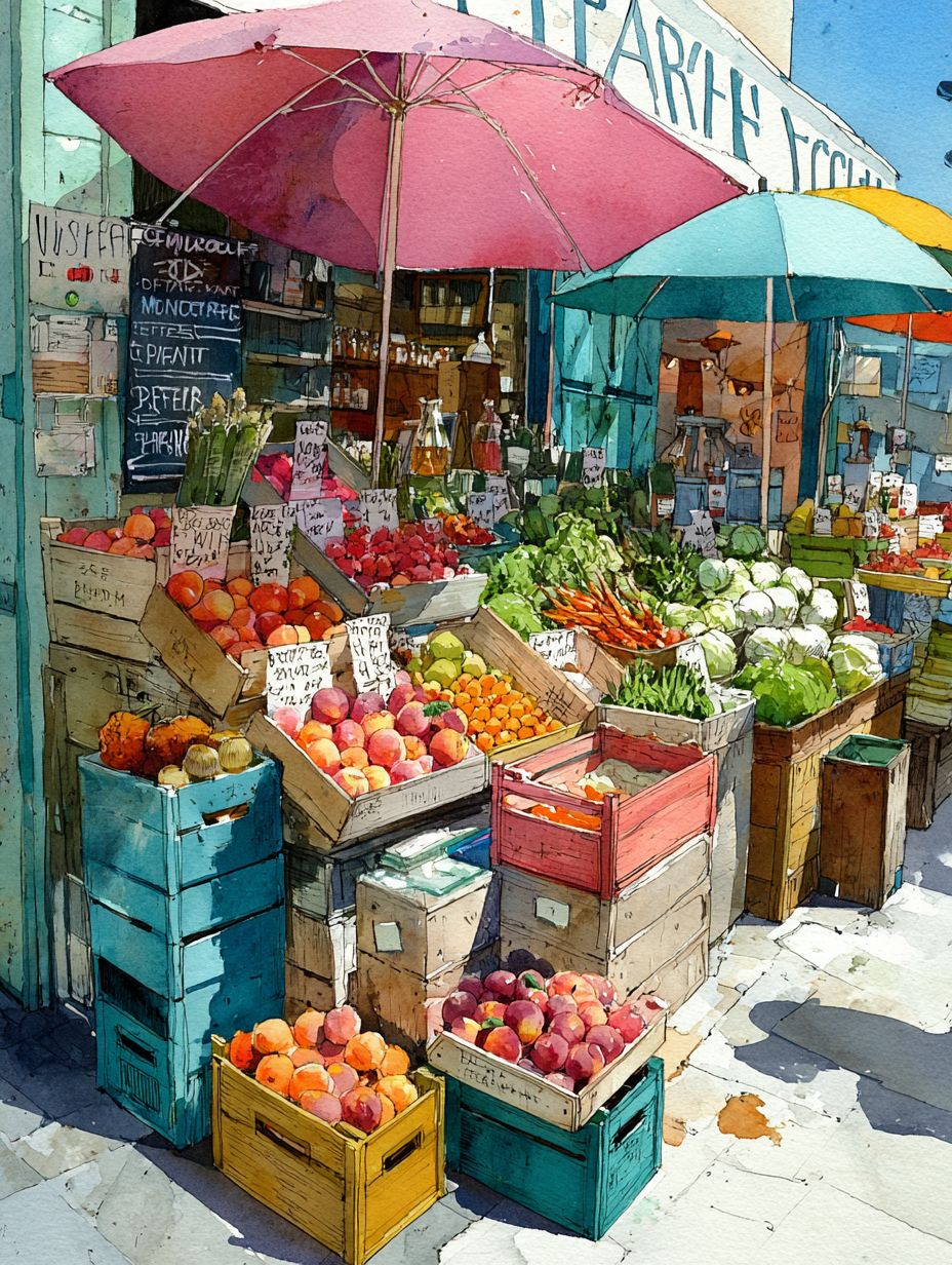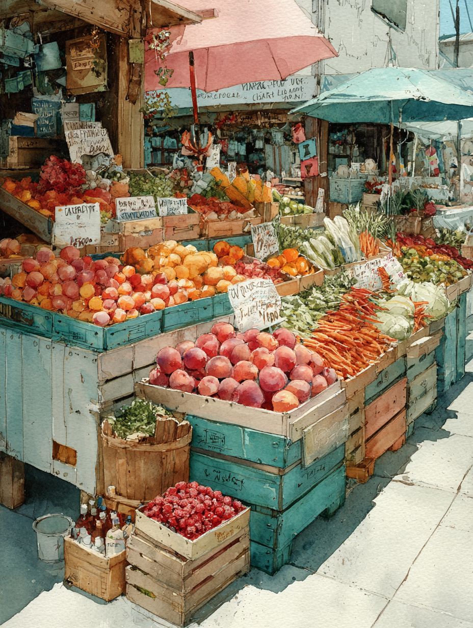 watercolor painting of the Union Square Greenmarket in New York City, stalls overflowing with fresh fruits and vegetables, vibrant produce like peaches, apples, berries, carrots, lettuces, and herbs, crates and baskets neatly arranged, handwritten signs, market umbrellas casting soft shadows, pastel color palette in shades of pink, orange, yellow, blue, green, and white, light and joyful atmosphere with minimal background --ar 3:4 --raw --stylize 250