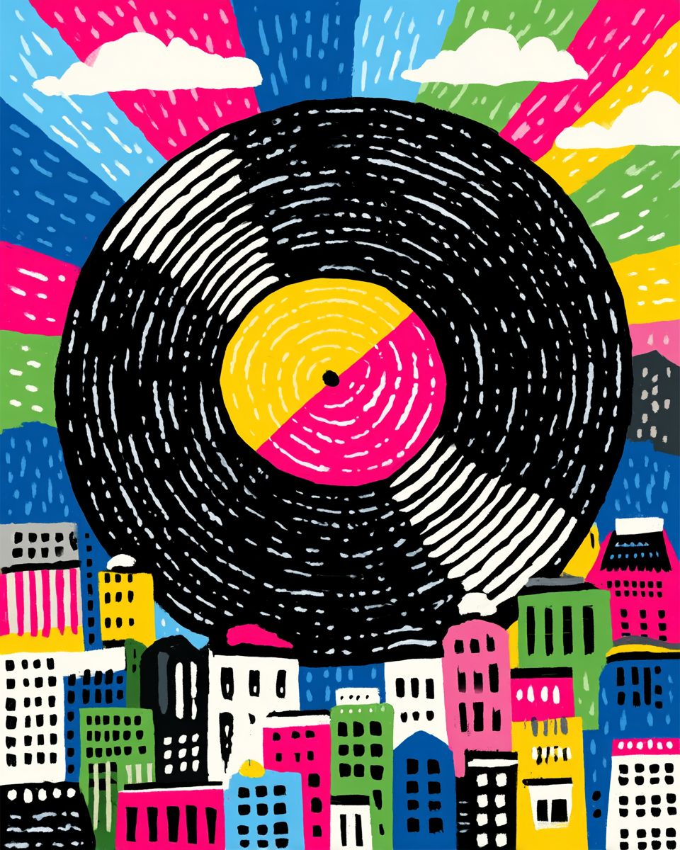 Vector poster of a stylized vinyl record where grooves form a complex maze, space for event or motivational phras --ar 4:5 --exp 50 --quality 4 --raw --profile tjmtsvj --stylize 500