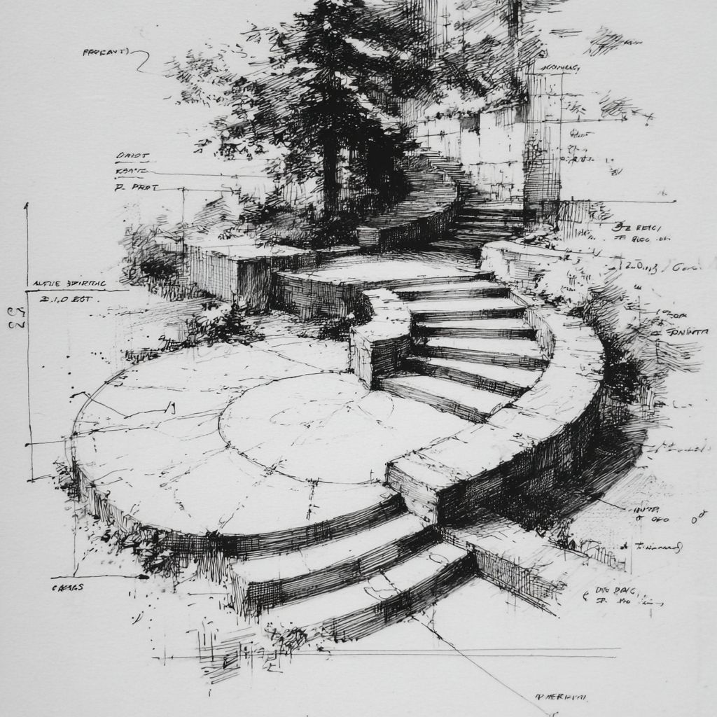 庭園の屋外に曲がった階段の手描きのスケッチ。ランドスケープアーキテクトの概念図のような2Dの俯瞰図。白い紙に黒インクで、ミニマリズム、初期デザインフェーズ。