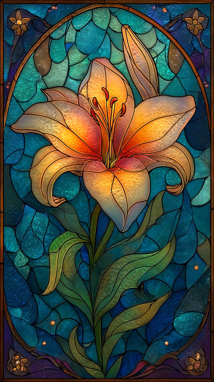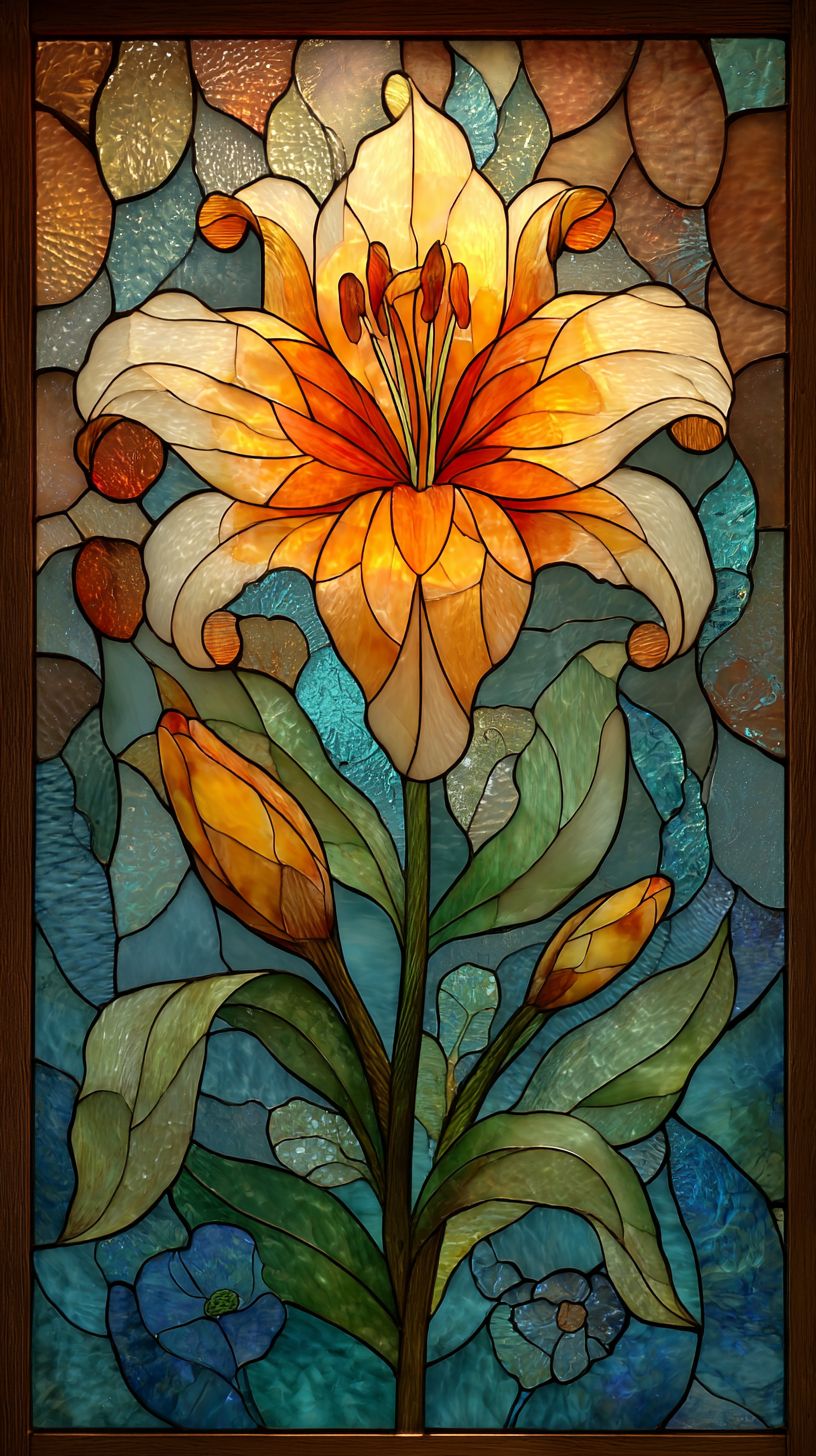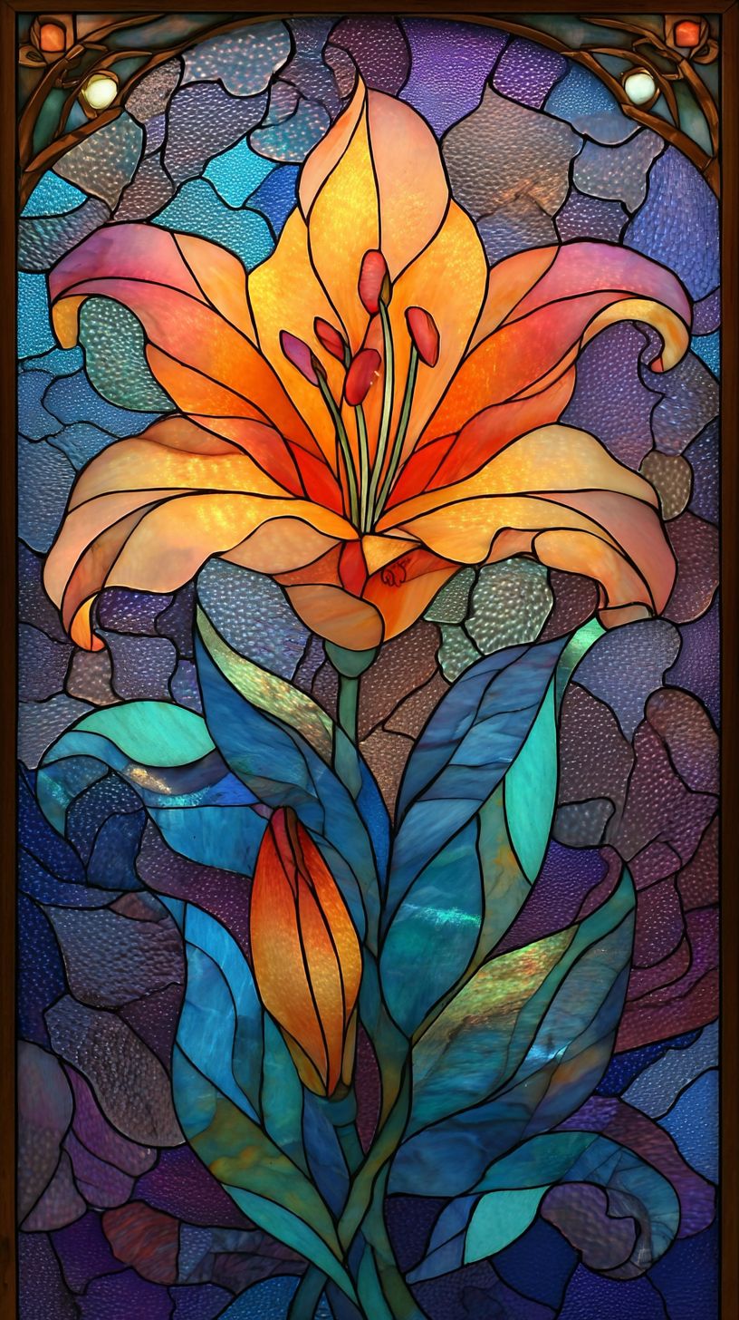 stained glass, lily, with a warm-toned background, --ar 9:16 --stylize 250