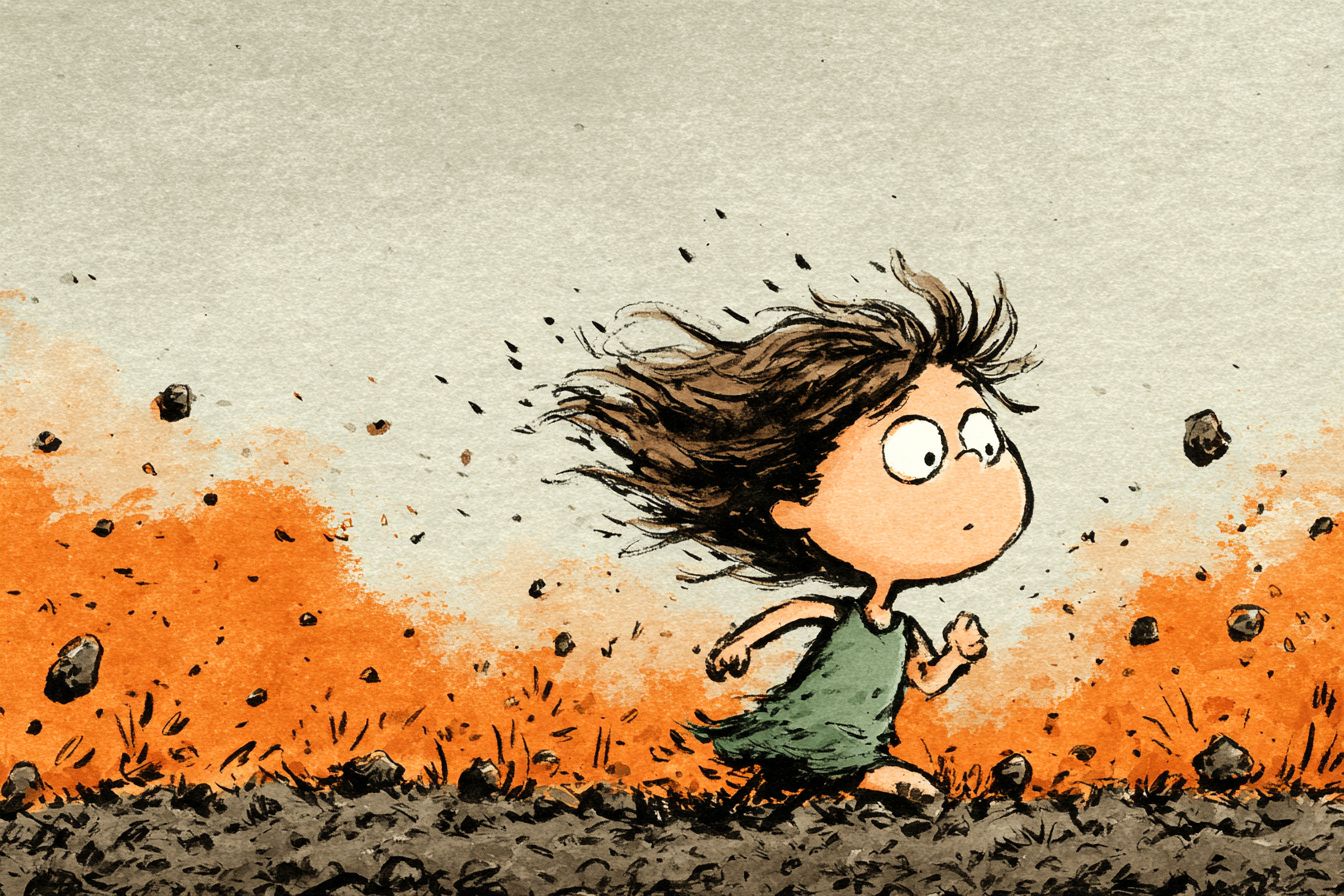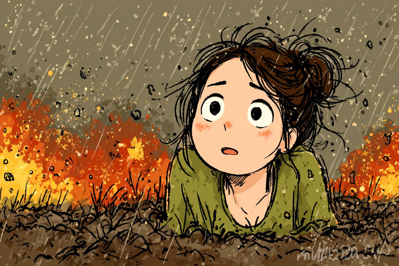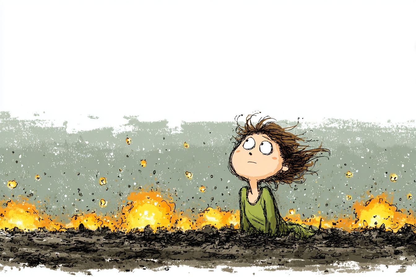 シンプルなカートゥーン風の線画、インクで着色した棕色の髪を持つ緩やかな緑のトップを着た女性のスティックフィギュアが、無人地帯でお腹を使ってうねっている様子、とても赤い顔をしており、遠くで爆発が起こっている。