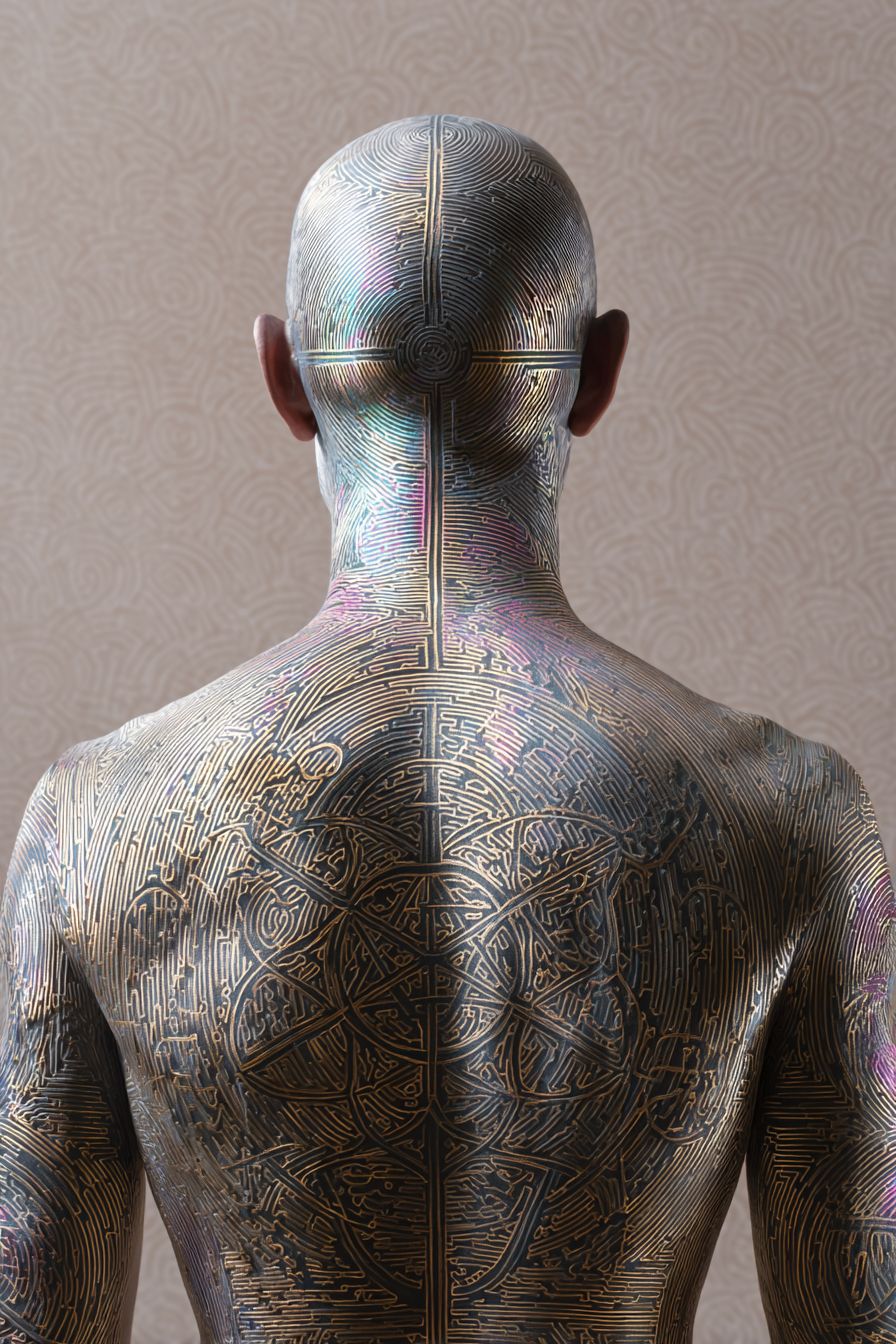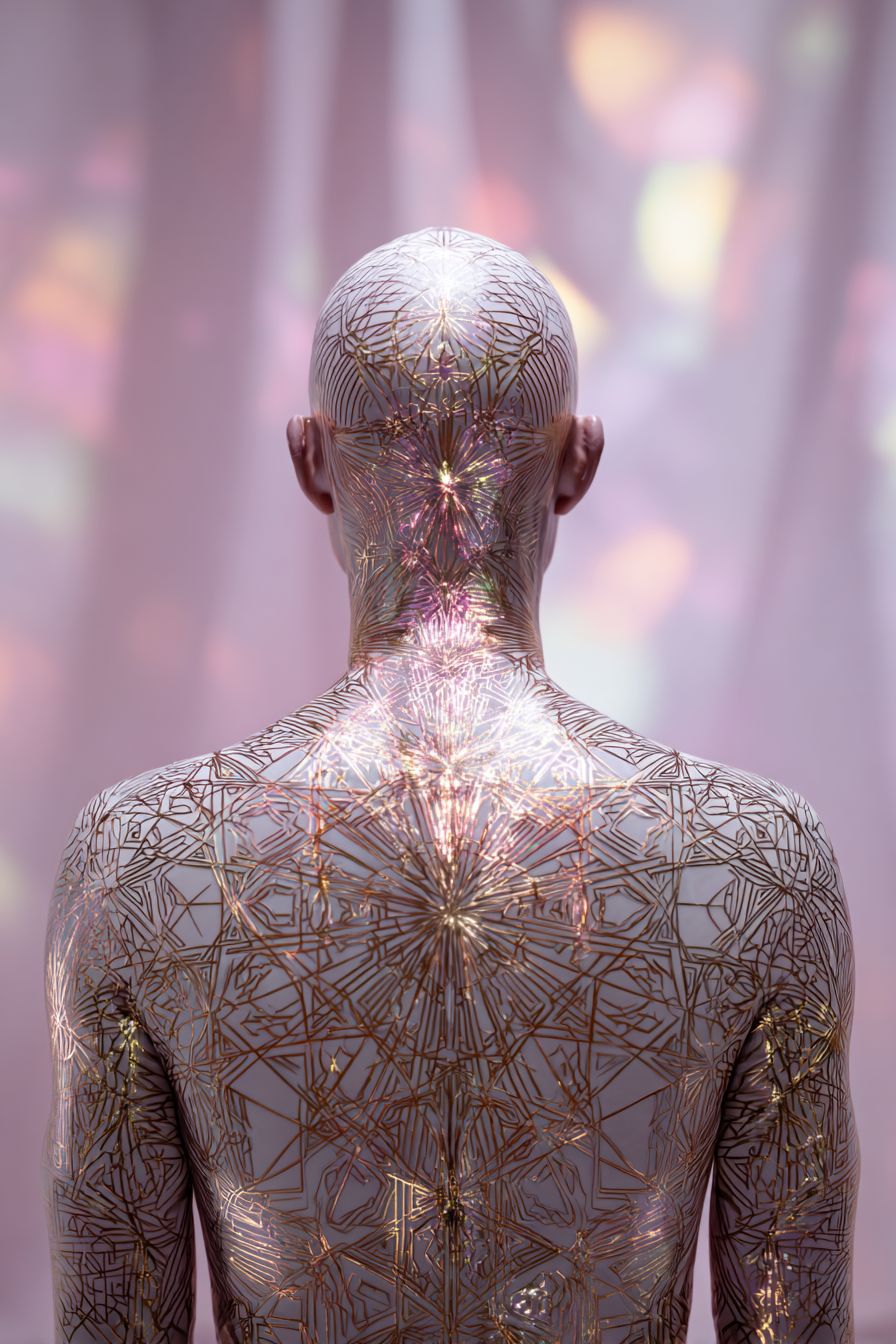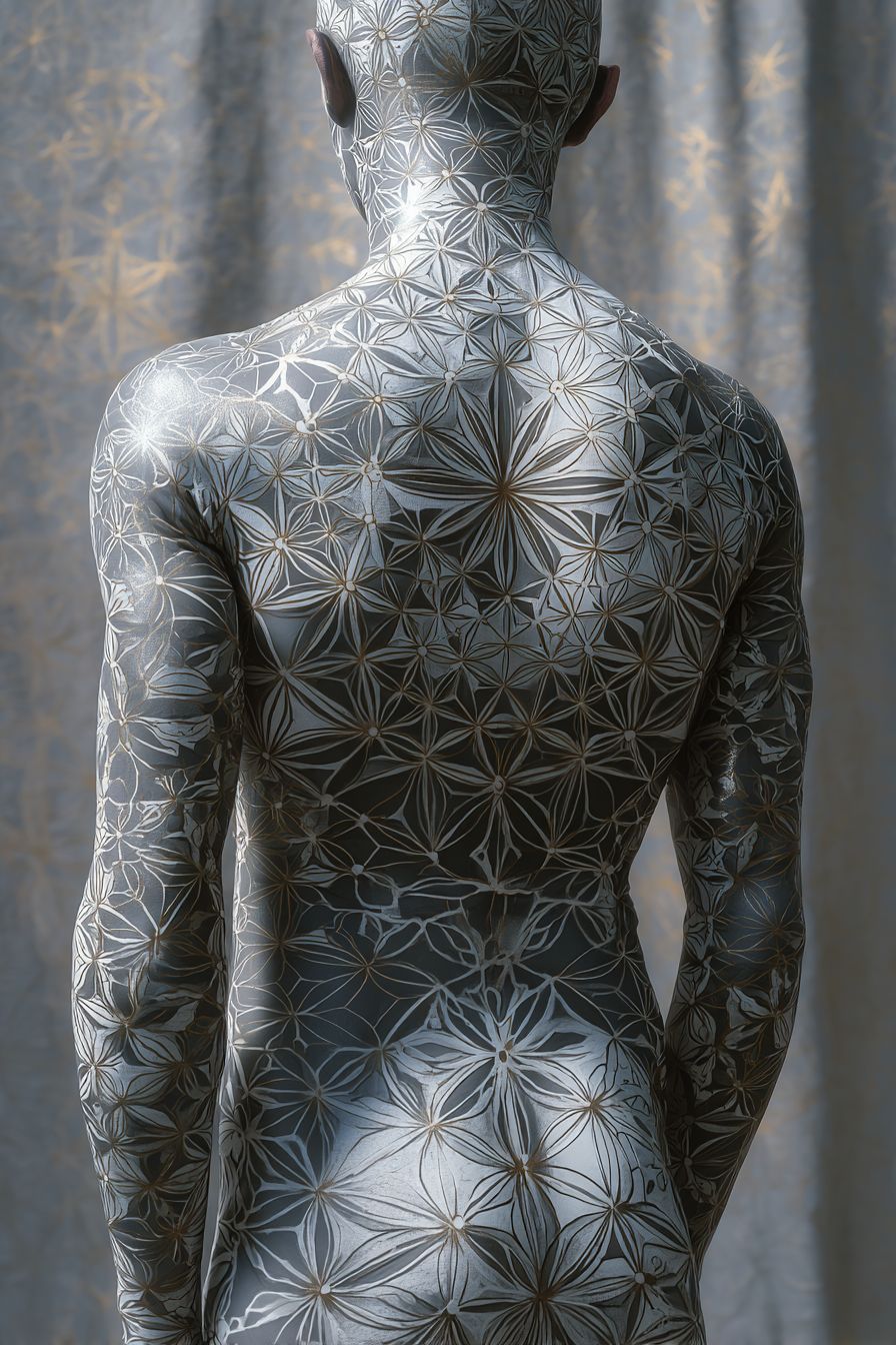 首から下の人間の姿勢の俯瞰図、全身が複雑な神聖幾何学のシンボル(メタトロンの立方、生命の花)で彩られ、ミニマリストの迷路パターンが微妙な金属インクで交差しています。純粋な芸術的表現、柔らかな環境スタジオ照明、シュールな対称性、背景の布やインスタレーションがボディペイントのデザインにマッチし、形状と背景がシームレスに融合し、光沢のあるカラーパレットには[色]のトーンが含まれ、フォトリアリスティックな肌のディテール、エレガントな構図、神聖で抽象的な美学、超詳細、ハイパーリアリスティックで概念的なファインアートの融合。