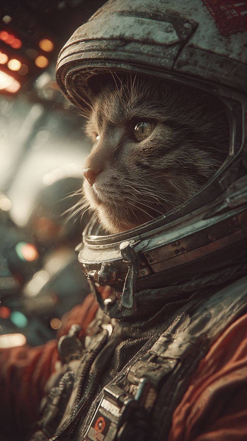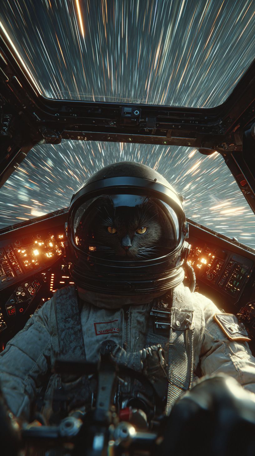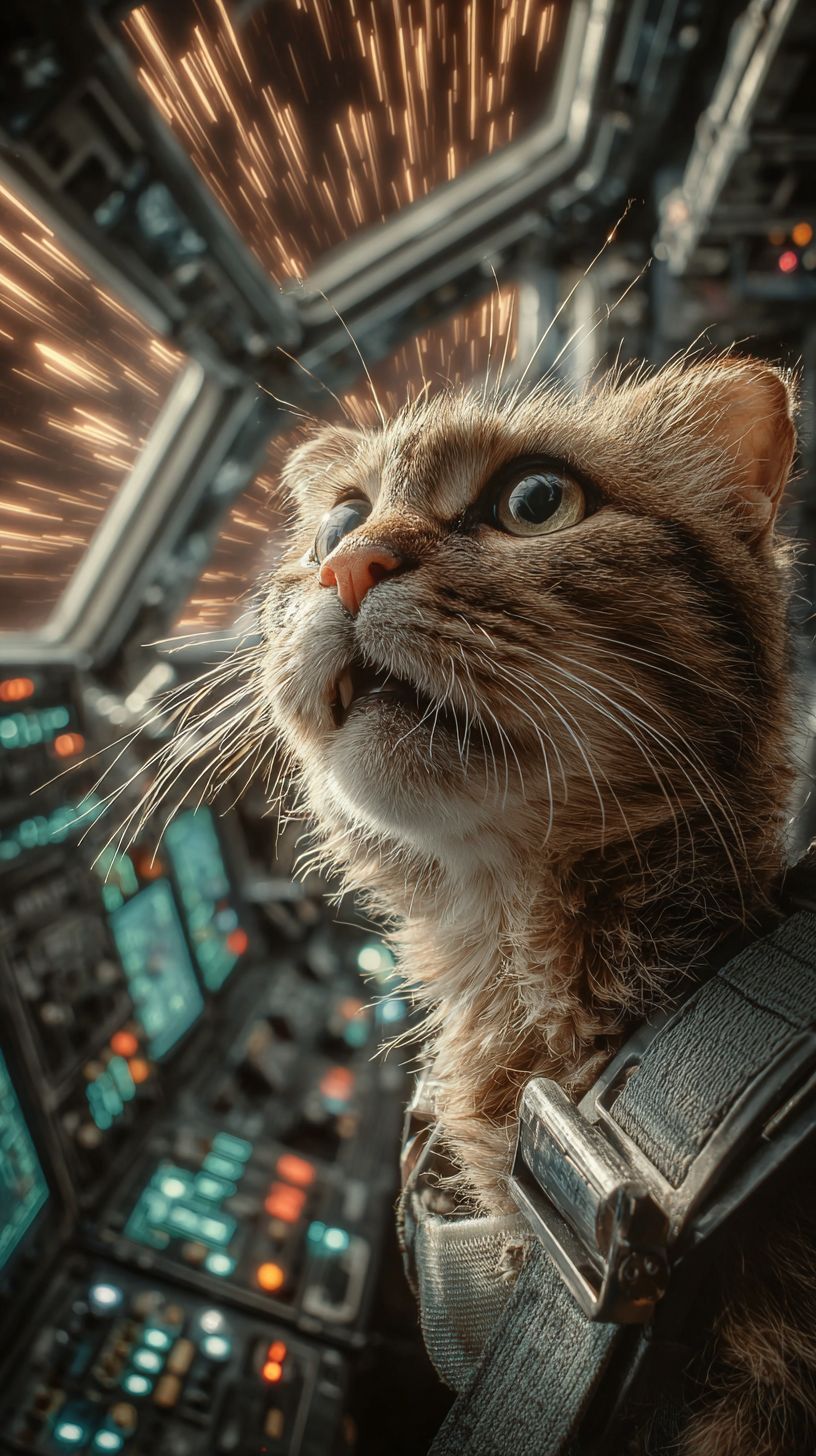 A cheese cat securely strapped into the cockpit of a sleek sci-fi spacecraft, hurtling through the cosmos at blistering warp speed. With each pulse of the engines, the ship vibrates and shudders intensely, forcing the cat’s cheeks to flatten against the helmet straps while its whiskers and fur trail straight back in the rush of G-forces. Outside the viewport, stars stretch into vibrant, glowing streaks of light. Inside the cockpit, futuristic holographic displays float and flicker with dynamic data, while sleek, touch-sensitive buttons glow softly on the control panels. Gentle camera shake simulates the ship’s powerful rumble, while subtle motion blur sweeps across the illuminated controls. Rich cinematic lighting bathes the cockpit, with console LEDs pulsing rhythmically in sync with the engine’s throbbing heartbeat. The scene culminates in a tight close-up on the cat’s wide, unwavering eyes gripping the yoke with fierce determination. --ar 9:16 --stylize 250 --v 7.0