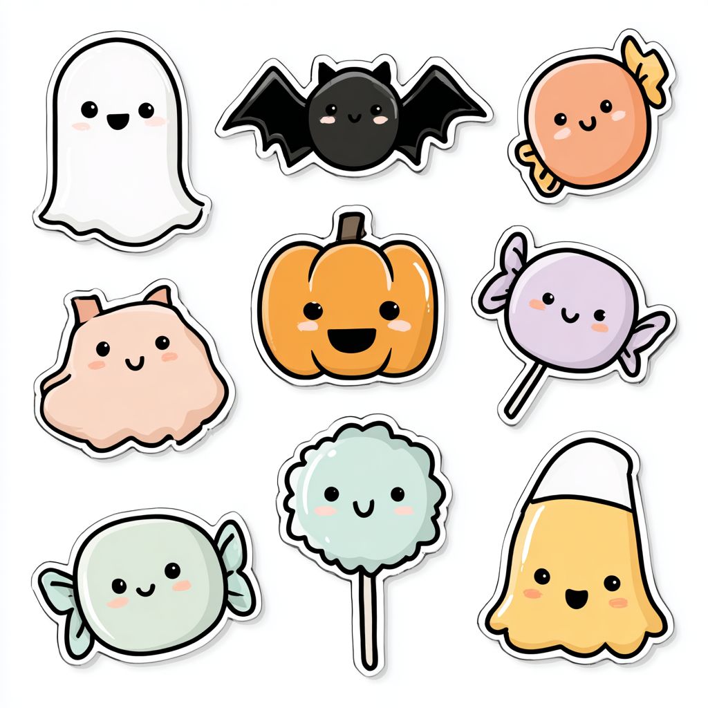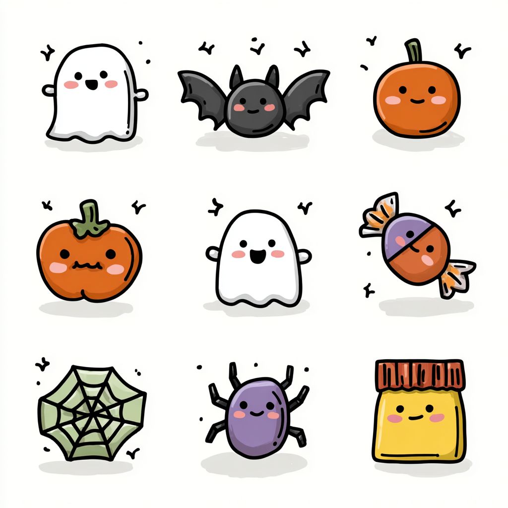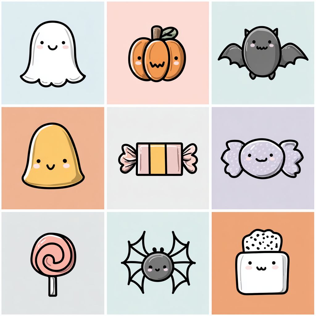 collection of cute Halloween clipart icons: small ghost, pumpkin, bat, spider, candy, each with pastel colors and black outline, cohesive kawaii style, transparent background, 1:1 tiles