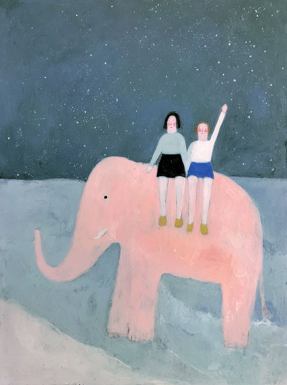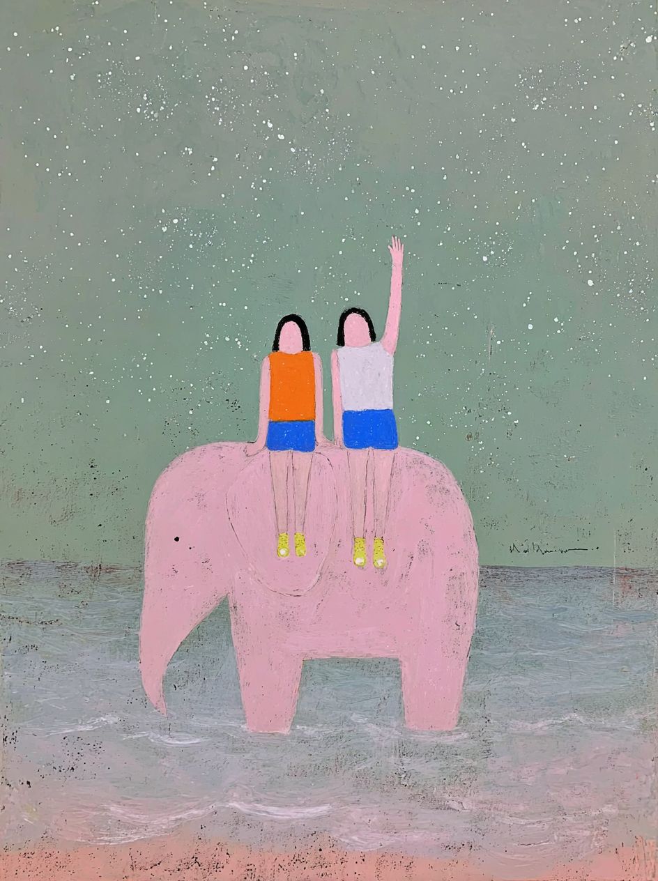 背に二人の子供が乗っているピンクの象の絵は、マイラ・カルマンのスタイルで描かれています。背景には星空と柔らかなパステルカラーの海があります。絵画には夢のような雰囲気、柔らかな光、パステルカラー、そして素敵な気分があります。小さな女の子は青いショートパンツと黄色い靴を履いています。二人とも手を挙げて、誰かに手を振ったり、前にある何かを指差したりしているかのようです。まるで彼らがちょっと前の楽しい瞬間について話しているかのようです。