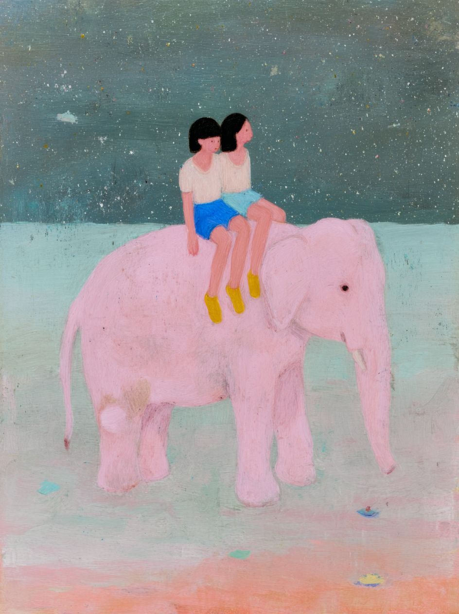 A pink elephant with two children sitting on its back, painted in the style of Myra Kalman. The background is a starry night sky and a soft, pastel-colored ocean. The painting has a dreamy atmosphere, soft lighting, pastel colors, and a lovely mood. The little girl is wearing blue shorts and yellow shoes. Both of them have their hands raised, as if waving to someone or pointing at something in front of them. It's as if they're discussing a funny moment that just passed. --chaos 5 --ar 148:199 --raw --profile hl1rxks
