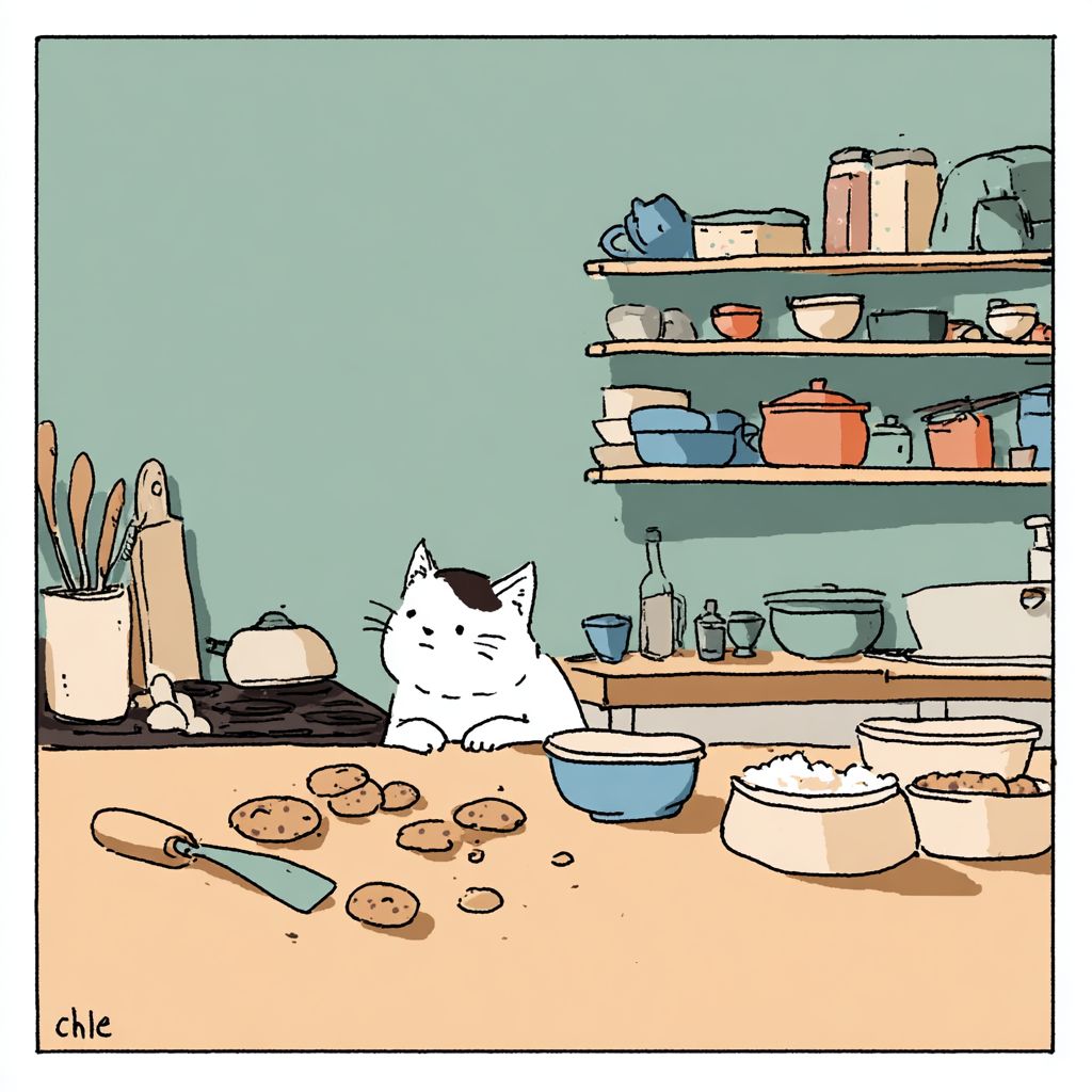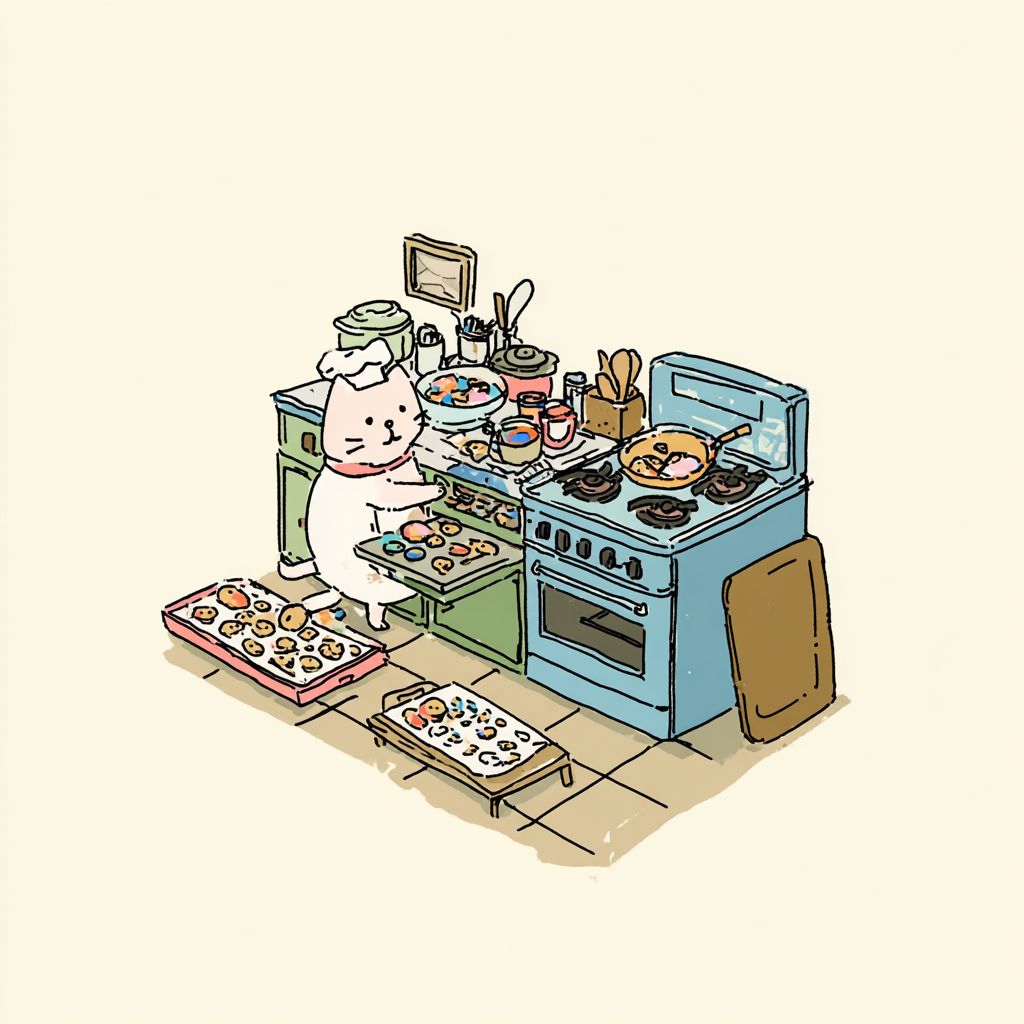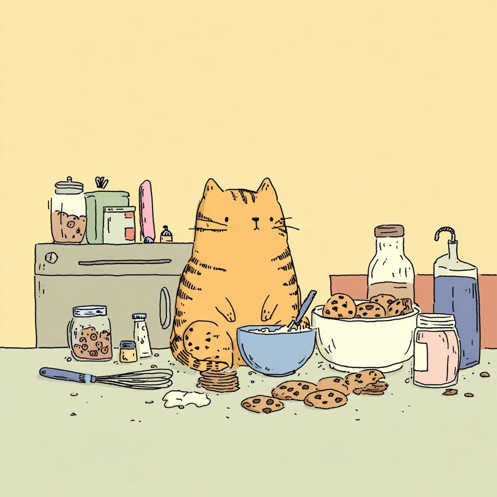 CUTE CARTOON CAT DOODLE BAKING COOKIES --profile cg921r2 --v 7.0