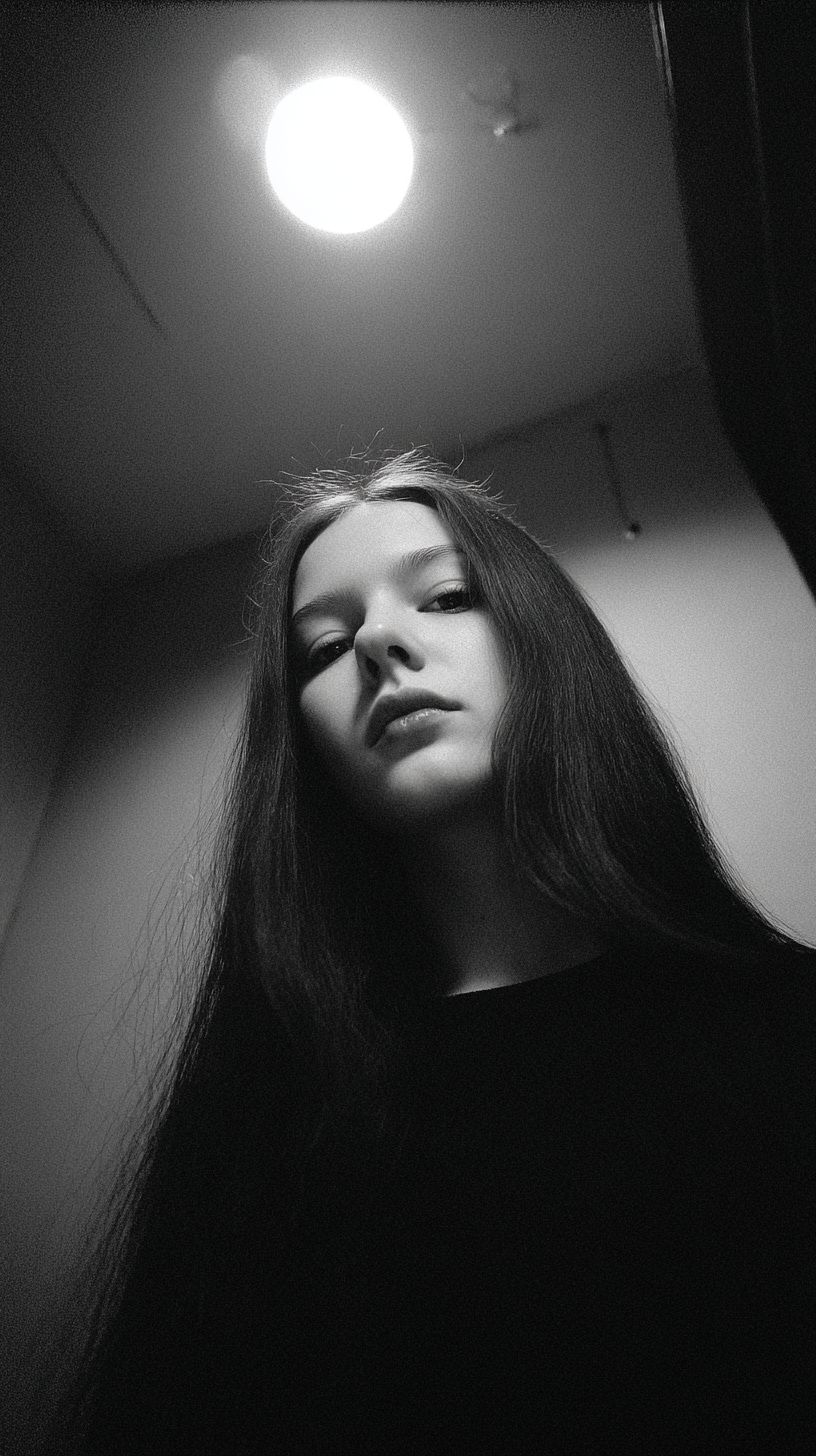 Moody close up forward straight on camera angle medium shot of a long haired Person standing under a ceiling light, the ceiling light is the only source of light. 1. Medium Photography 2. Style and Realism is Noir 3. Color Scheme is Monochrome black and white 5. Intent is dark haunting, narrative story driven 6. Subject is One person with long hair wearing a black shirt 7. Composition is a straight on camera angle, close medium style shot 8. Lighting is Top light 10. Influence and Inspiration Moody Noir realism --no low hero angle shot --ar 9:16 --v 7.0