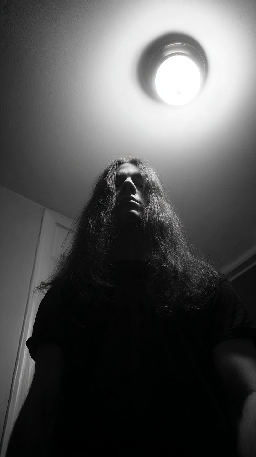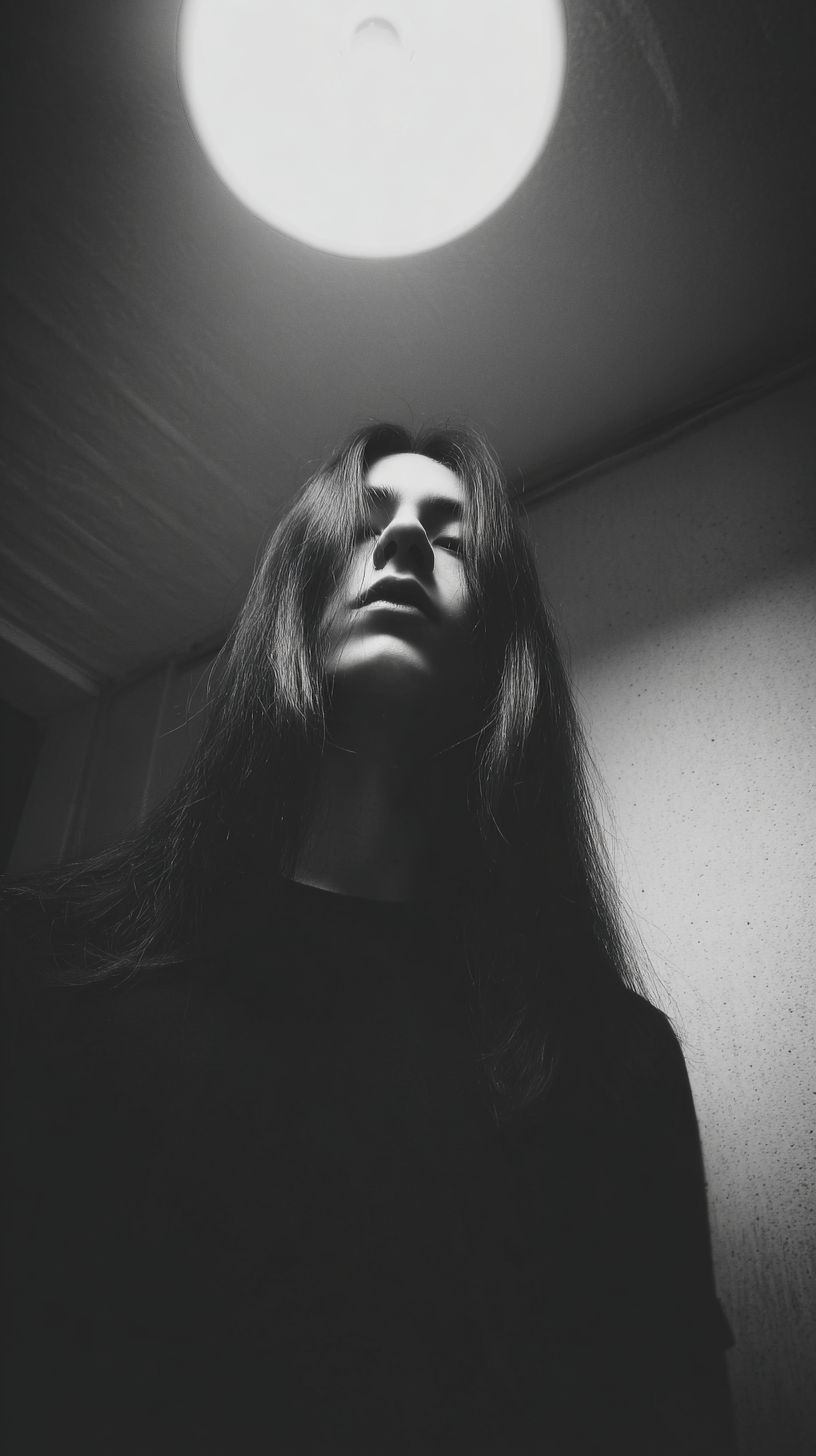 ムーディなクローズアップ、長髪の人物が天井のライトの下に立っているショット。天井のライトが唯一の光源です。1. 中程度の写真 2. スタイルとリアリズムはノワール 3. カラースキームはモノクロ黒白 5. 意図は暗くて恐ろしい、物語性がある 6. 主題は黒いシャツを着た1人の長髪の人 7. 構図は正面からのカメラアングル、中程度のスタイルショット 8. 照明は上からの光 10. 影響とインスピレーションはムーディーなノワールリアリズム