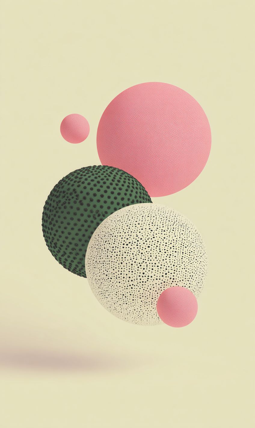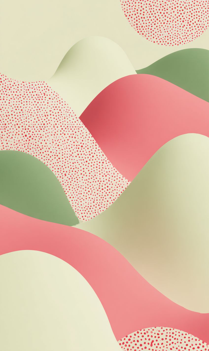 Abstract 3d shapes centered in the middle of the composition. Fluroescent colours, vector illustration, with pink and green details. The design incorporates bright white, bold patterned dots, and is isolated on a light cream background. It features fluid forms that blend seamlessly into the composition, creating an elegant yet playful atmosphere. This artwork would be suitable for use as a logo or branding element in advertising, marketing, social media content, web design, print materials, graphic designs. --ar 42:71 --raw --profile vz3ysfr --v 7.0