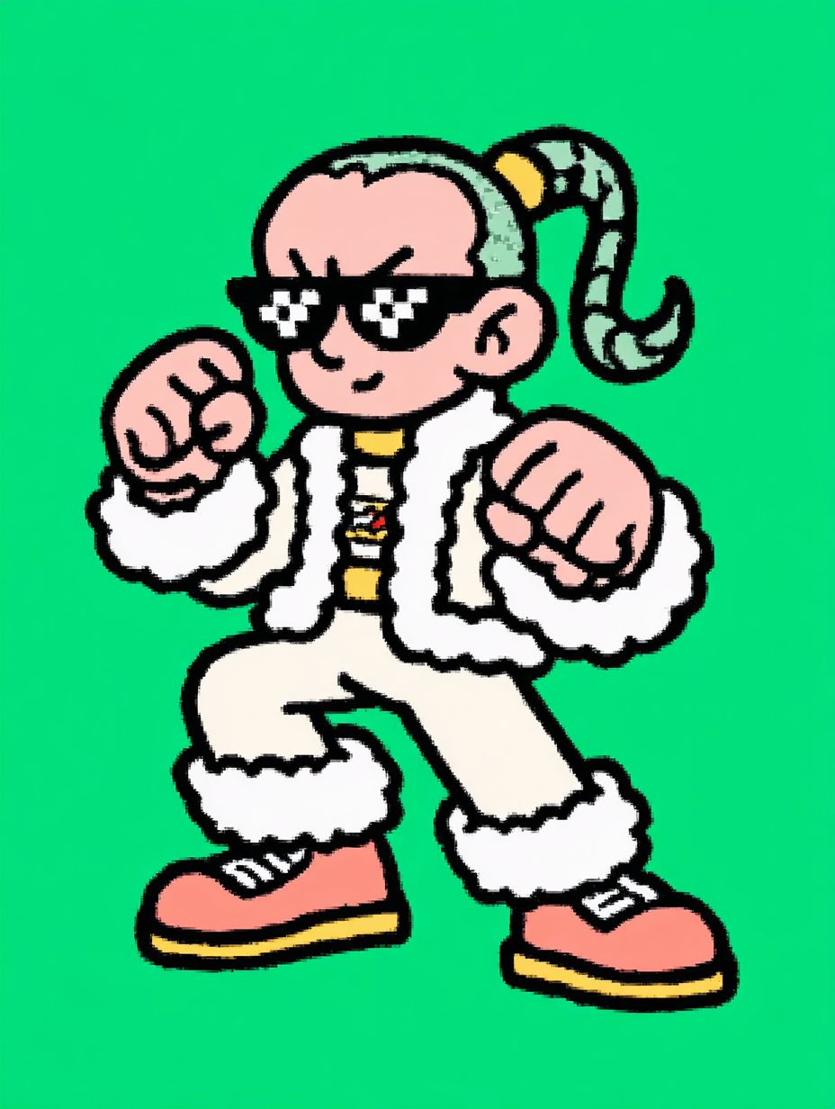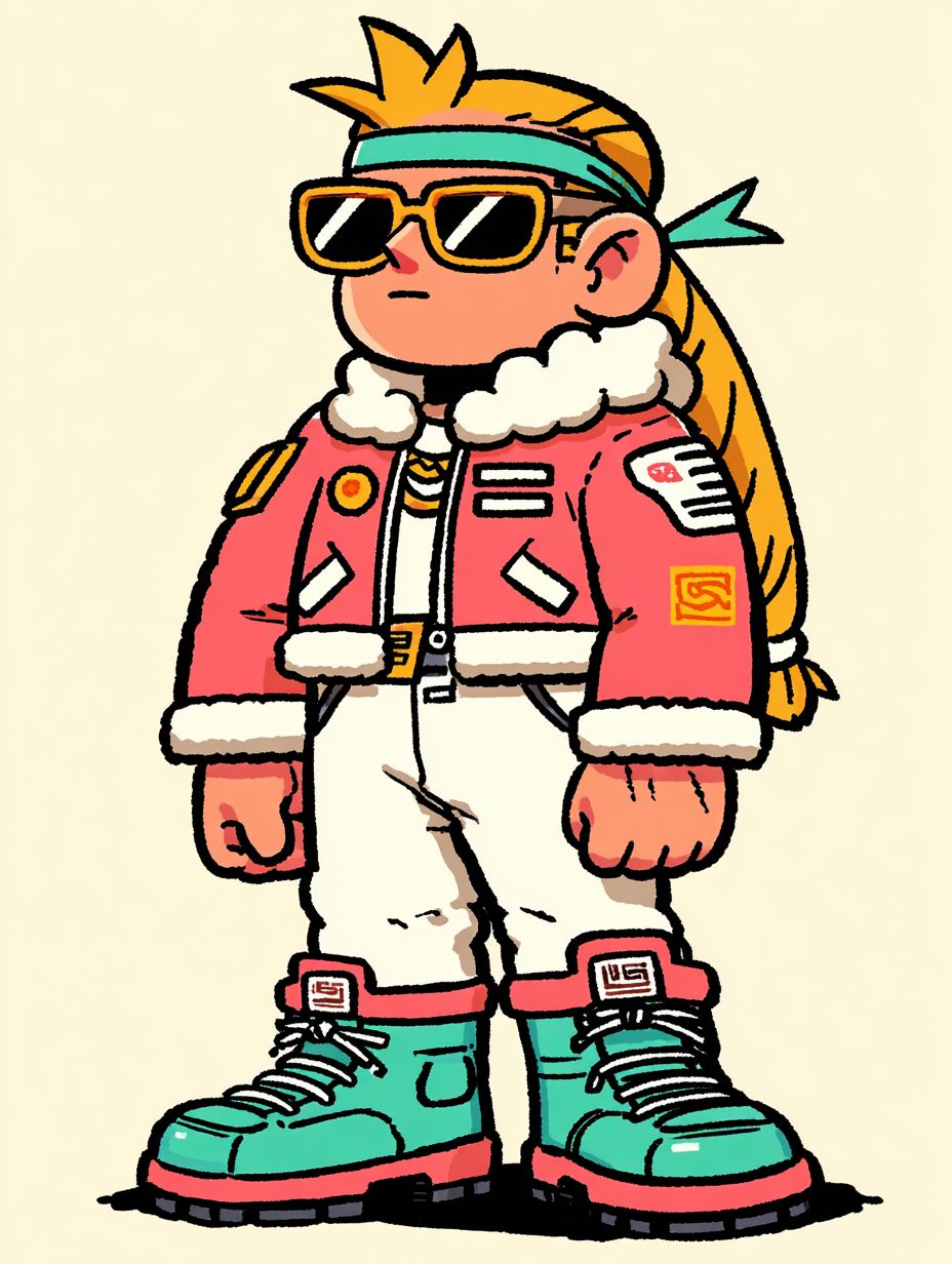 very simple tall traditional lanky swiss tall raver man character with ponytail and headband making a cocky pose, big nose and chin, big sunglasses on, fur cuff white tracksuit, snow boots, highly simplified 90s anime art style, harmonious colour scheme, full body, cocky pose. low detail, thick outline. --chaos 15 --ar 3:4 --sref <https://s.mj.run/jUbN7HutloE> <https://s.mj.run/ZnPIPK7X3hc> --profile jf9g2yb --v 7.0