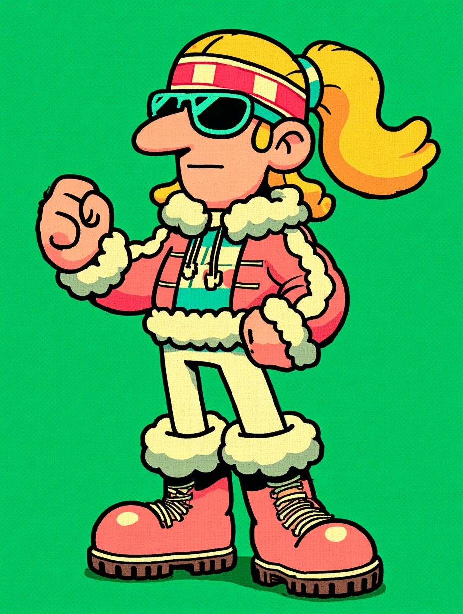 非常シンプルで背が高く伝統的な細長いスイスの男性キャラクターで、ポニーテールとヘッドバンドをつけ、自信満々のポーズをとり、大きな鼻と顎、大きなサングラスをかけ、ファーのカフ付きの白いトラックスーツ、雪靴を履いています。90年代アニメスタイルの非常にシンプルなアートスタイルで、調和の取れたカラースキーム、全身、自信のあるポーズ。低詳細、太い輪郭。
