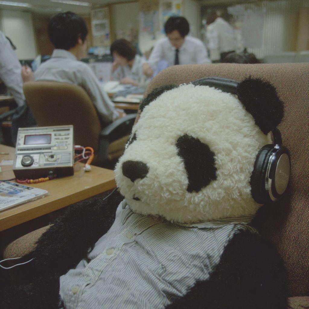 携帯電話のカメラで撮影された自撮りは、人間のようなパンダがオフィスの椅子にうなだれている様子を示しています。背景には忙しいオフィスワーカーがいます。パンダは疲れた様子で、シャツを着ています。パンダはヘッドフォンで音楽を聴いており、隣のテーブルにはウォークマンがあります。