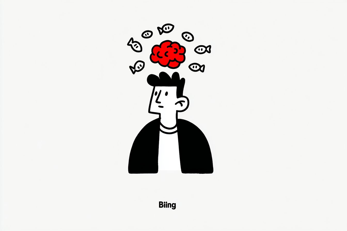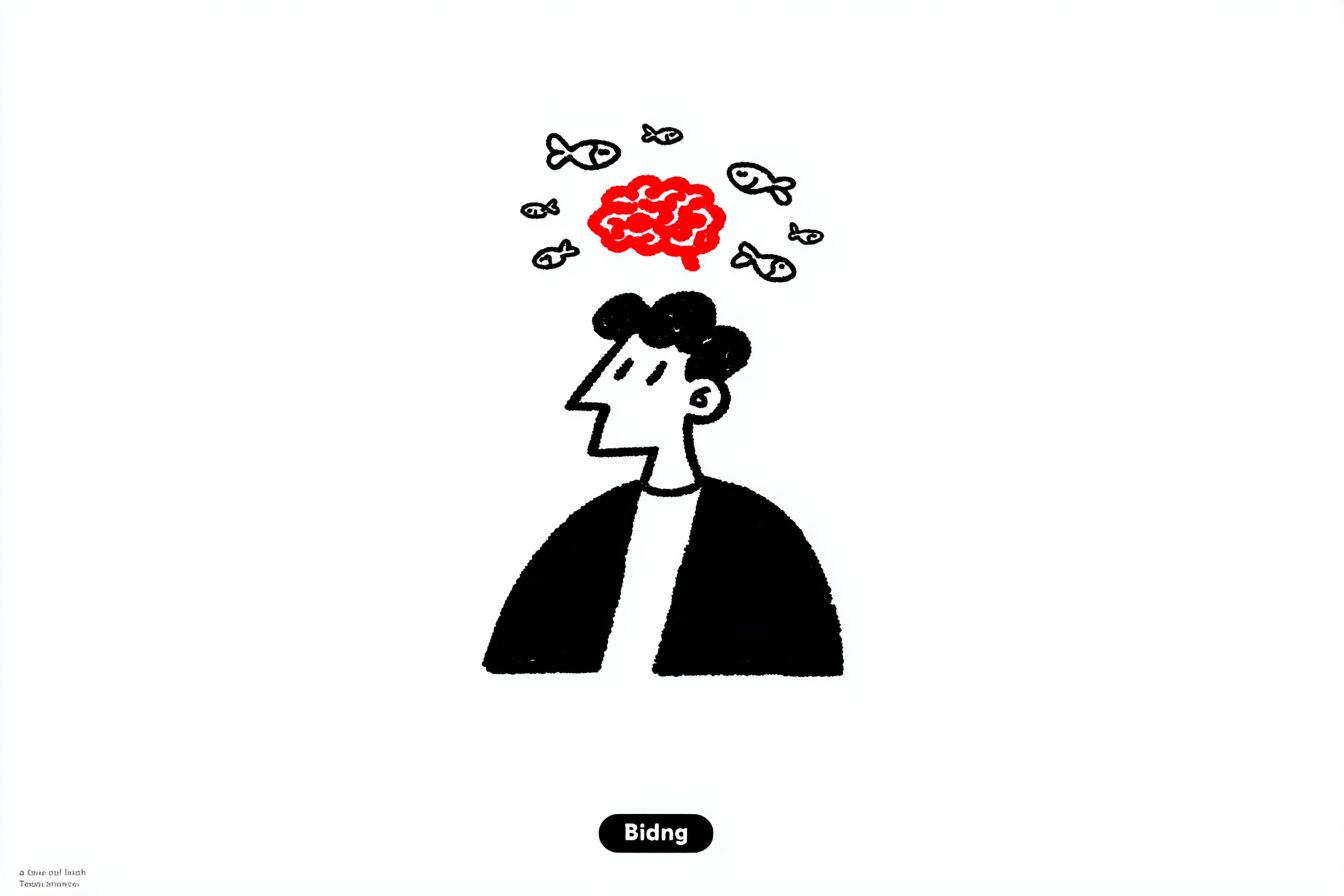 大人の男性を描いたミニマリストのカートゥーンで、彼の頭が上にあり、黒いブレザーと白いTシャツを着ています。赤い脳が彼の頭の上で浮いており、周りには小さな魚のアイコンがあります。背景は純白で、各要素を際立たせています。キャラクターデザインと描画の詳細はシンプルな線で、深い青や暗い灰色などの鮮やかな色を使用しています。右下には「Bidding」というテキストがあります。