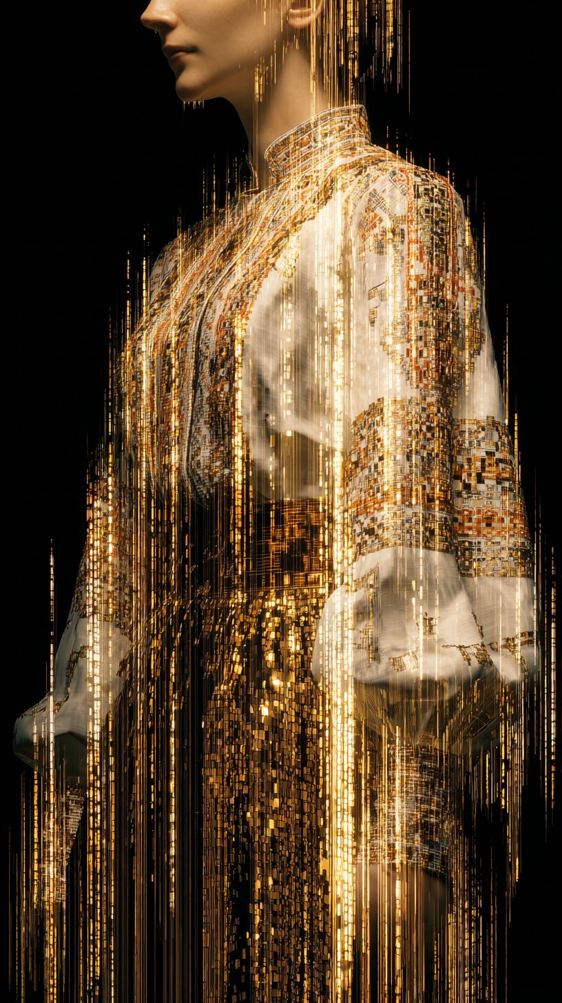 伝統的なルーマニアのブラウス(ie)が、優雅に金色のデジタルラインへ溶け込み、布地が明るいデータストリームに溶け込んでいく。民族刺繍と未来的なコードの融合、流れるテクスチャ、映画的な照明、詩的なテクノ美学、高詳細、輝く金の糸がピクセル化された流れに変わる、超現実的でありながら優雅。