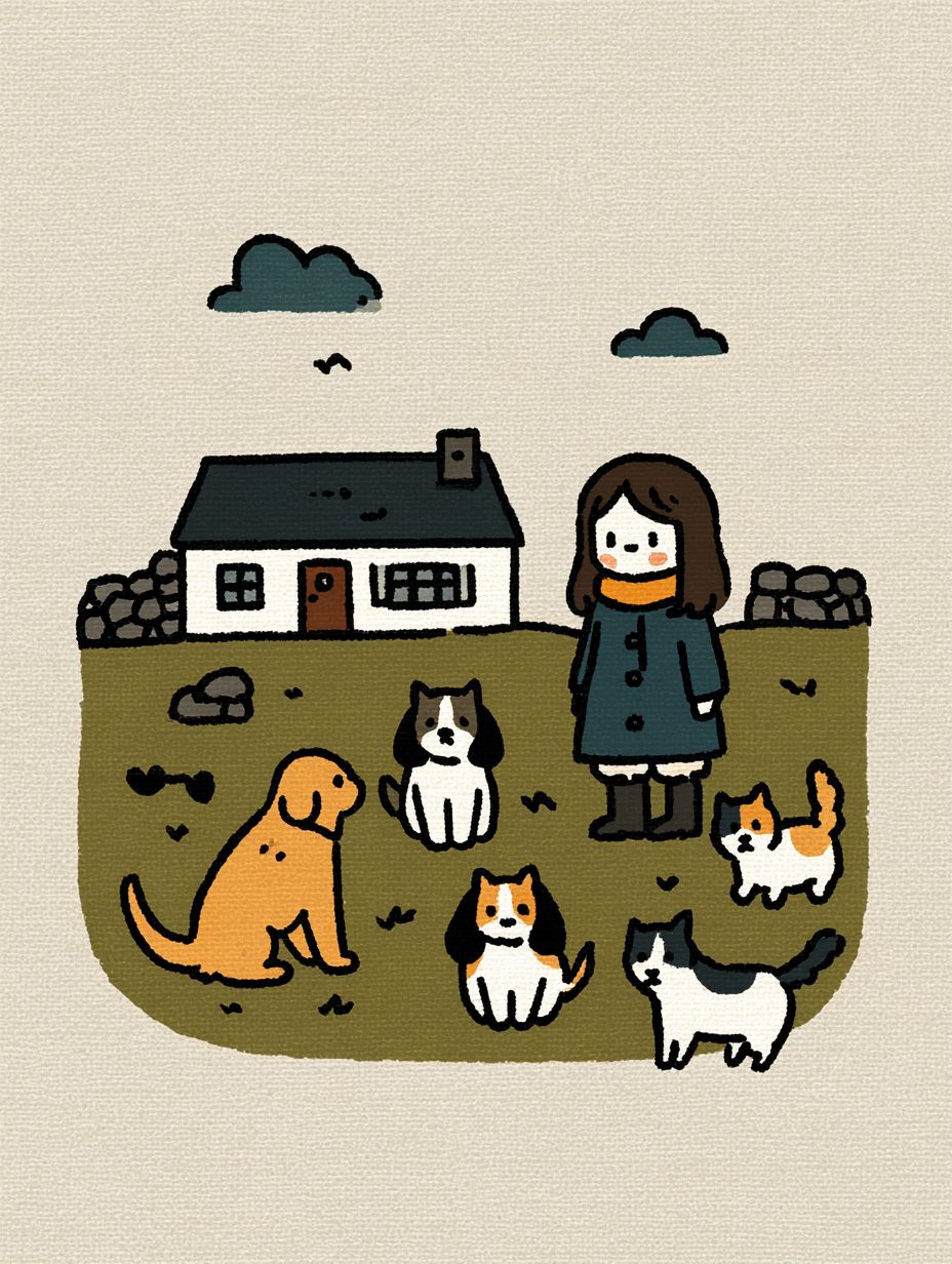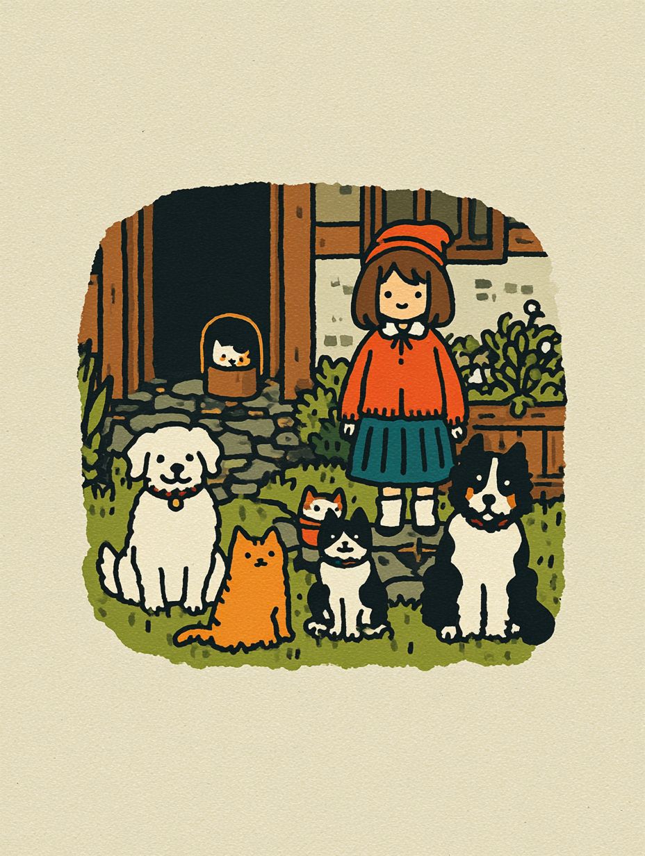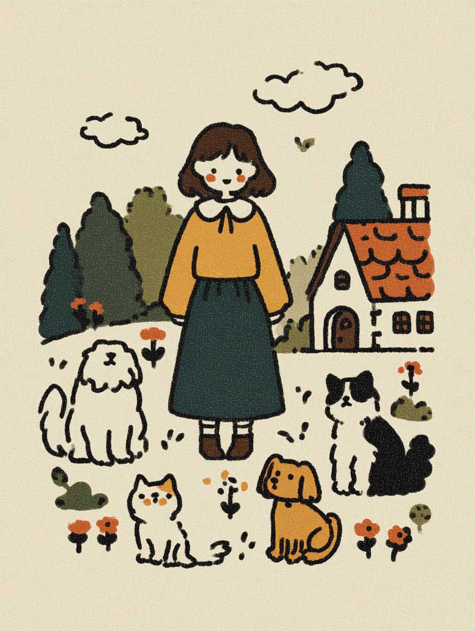 内モンゴルの居心地の良い農家の中庭を描いた絵本風のイラスト。元気な若い女性が、いくつかの遊び好きな猫と3匹の友好的な犬に囲まれています。犬はラブラドール、キャバリア・キング・チャールズ・スパニエル、ボーダー・コリーです。子供のような whimsical スタイル、シンプルな手描きのライン、柔らかく温かい雰囲気、絵本のイラスト、遊び心満載で居心地の良い感じ。